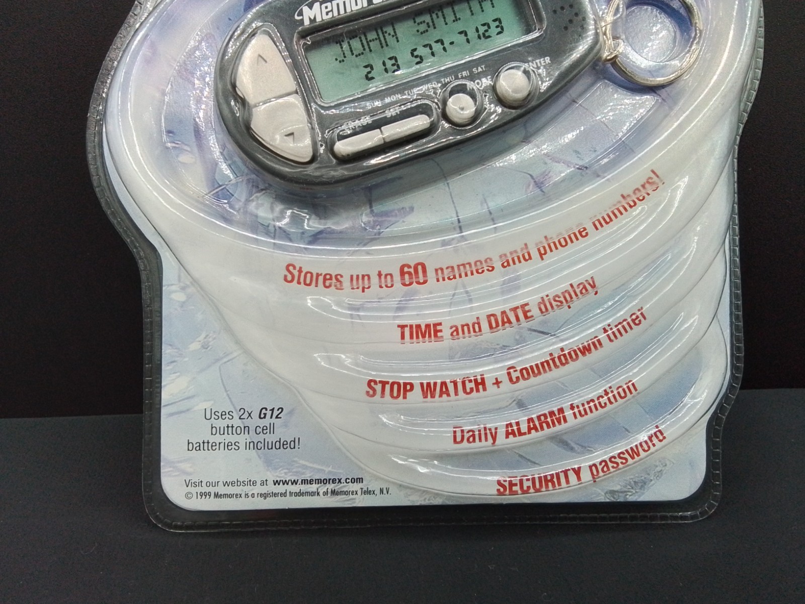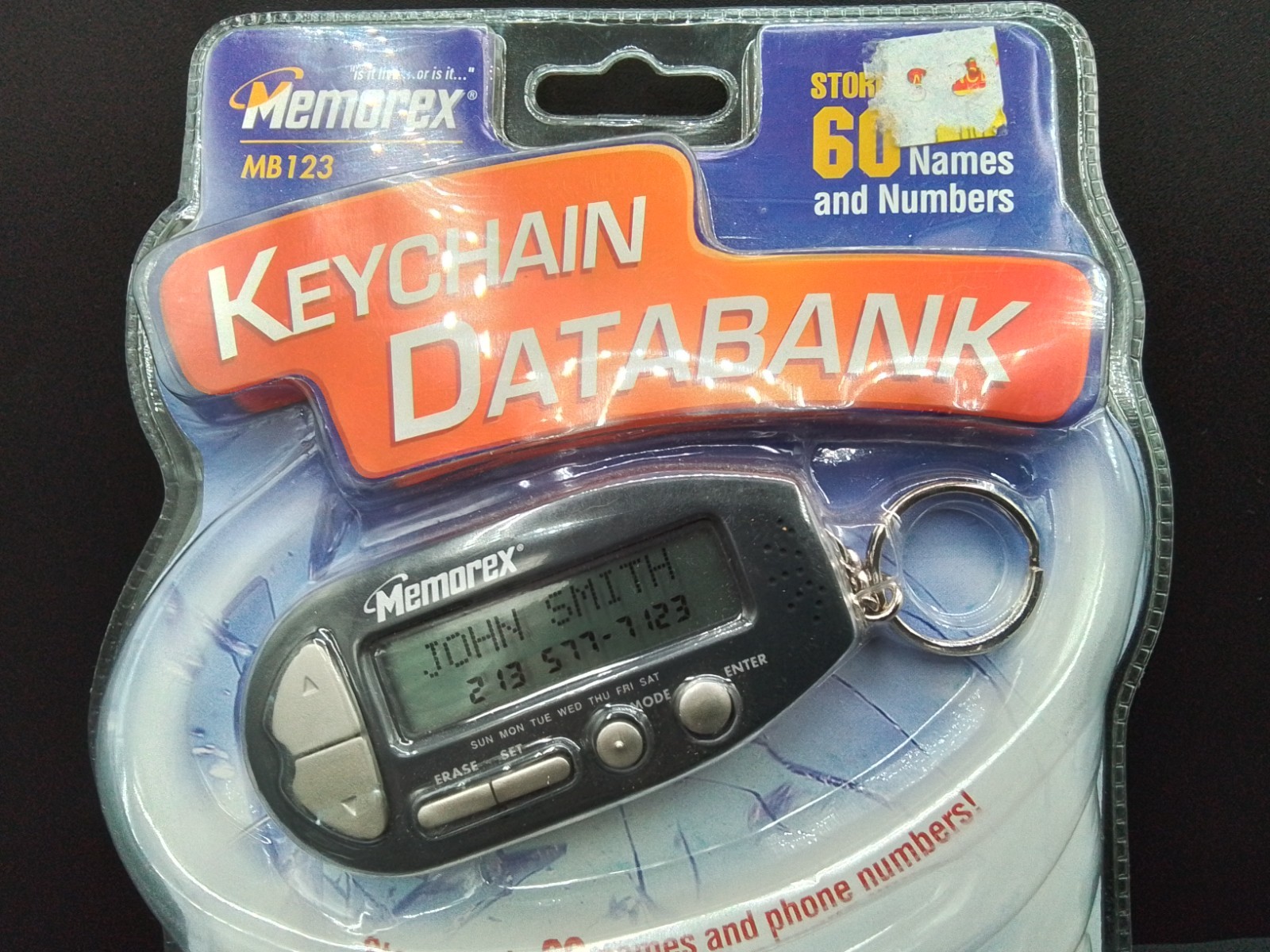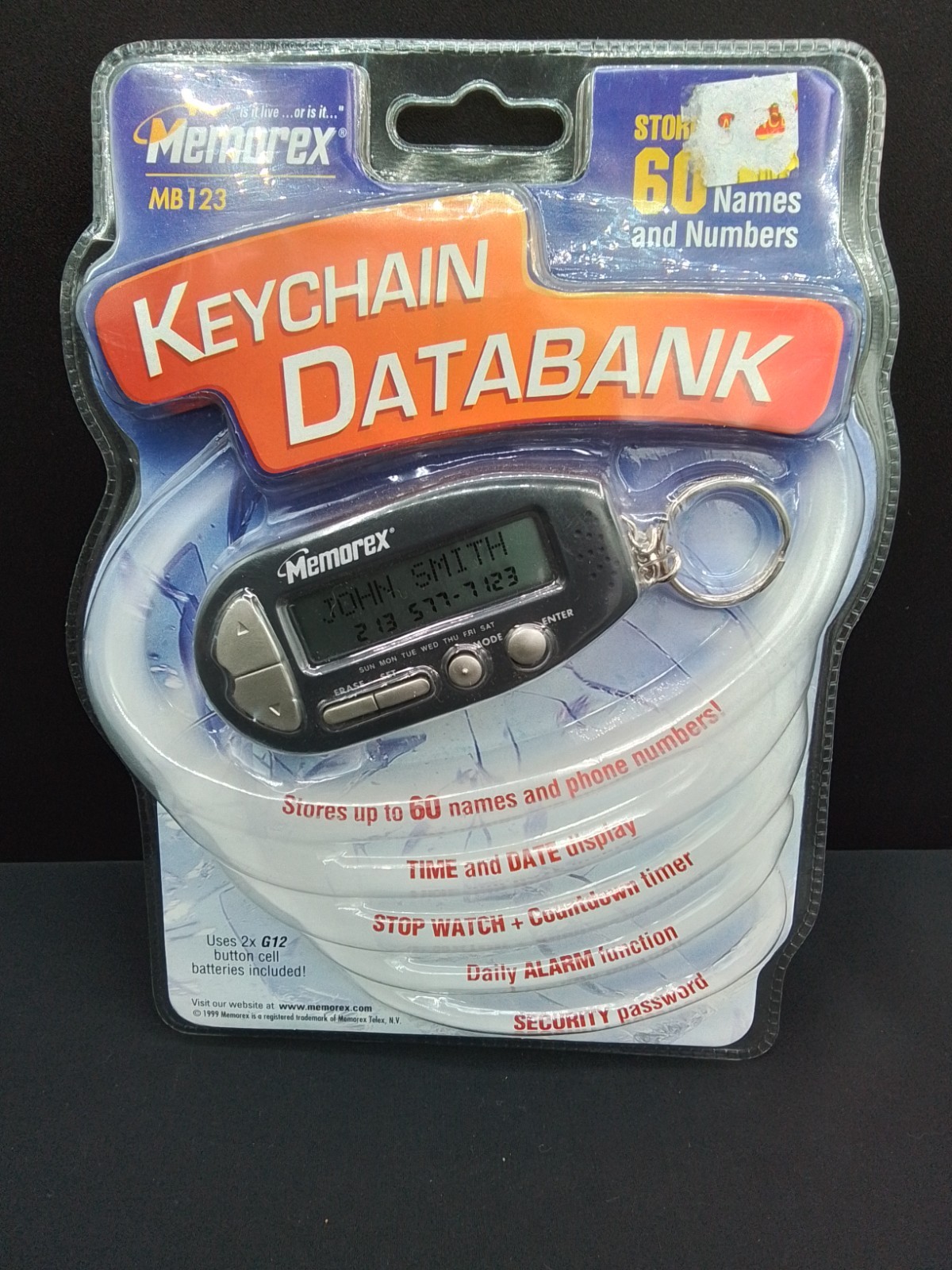 MEMOREX KEYCHAIN DATABANK MB123 STORES 60 NAMES NUMBERS TIME DATE ALARM NEW VTG