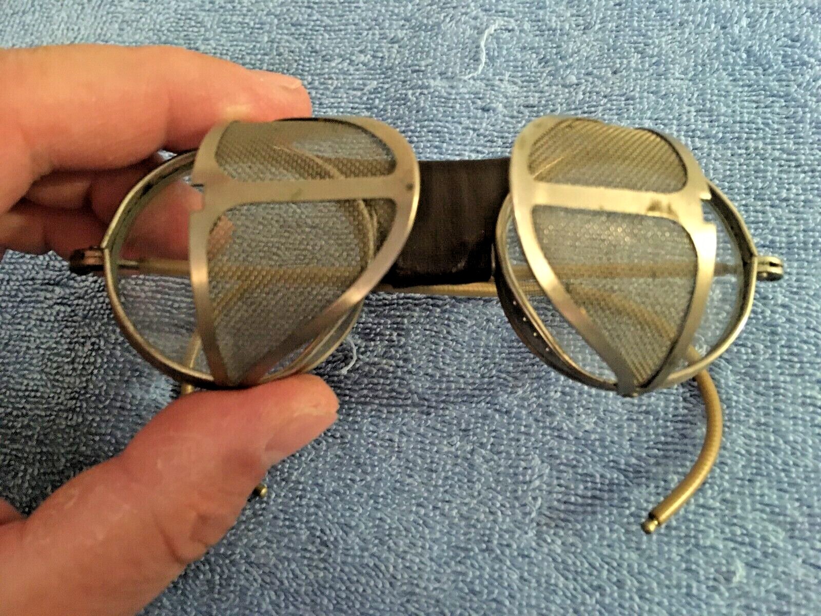 VINTAGE W GLASS FOLDING SAFETY GLASSES WIRE SCREEN STEAMPUNK MOTORCYCLE AVIATOR