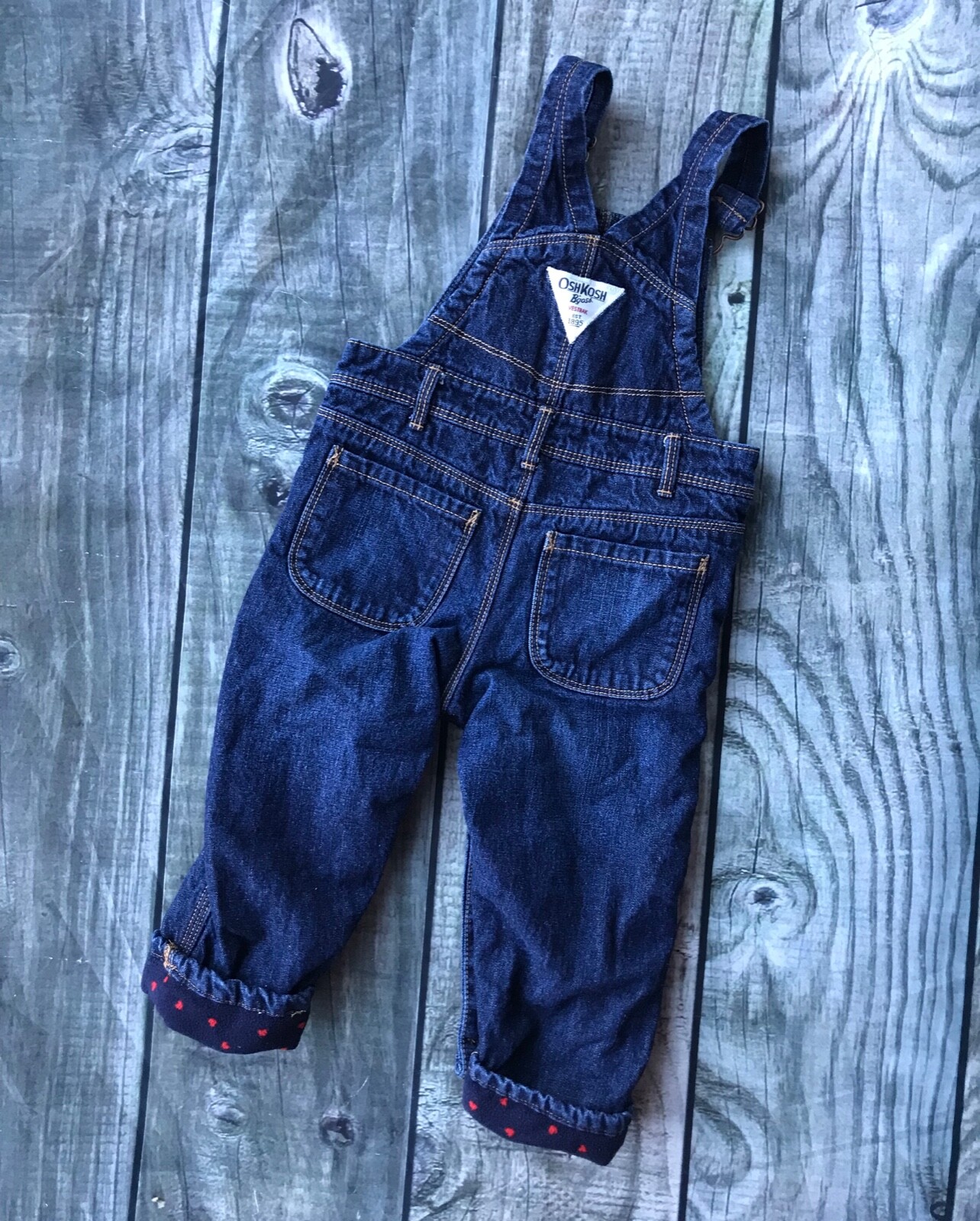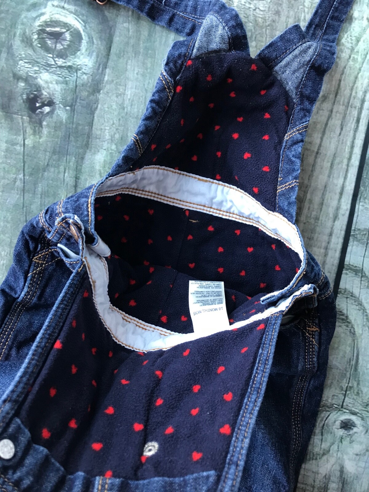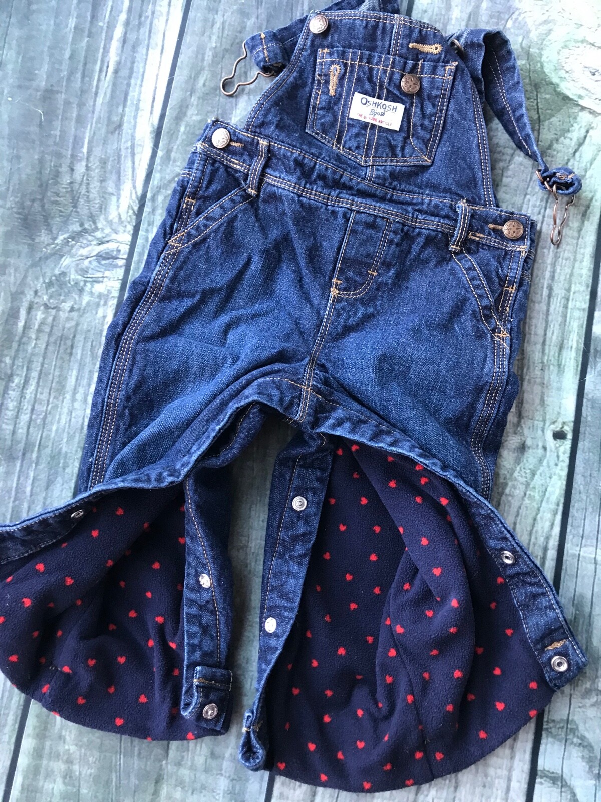 как выглядит Oshkosh B gosh Vestbak 18 Months Jean Bib Overall Fleece Lined Hearts Snap Legs фото
