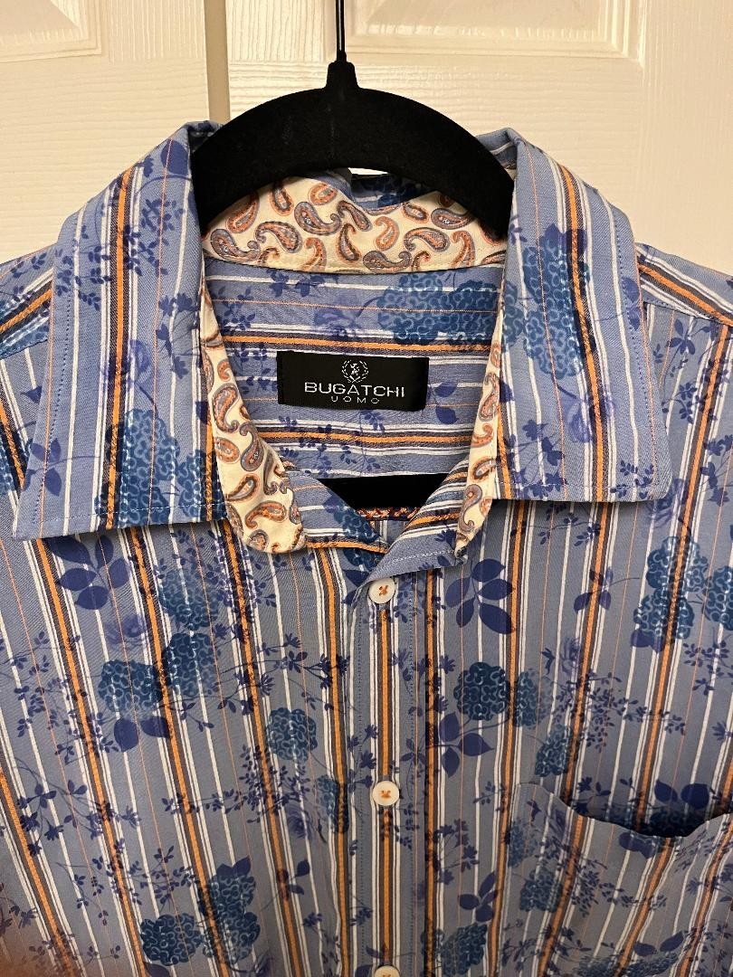 как выглядит BUGATCHI LONG SLEEVE BUTTON DOWN SHIRT STRIPES AND FLORAL ACCENTS SIZE LARGE фото