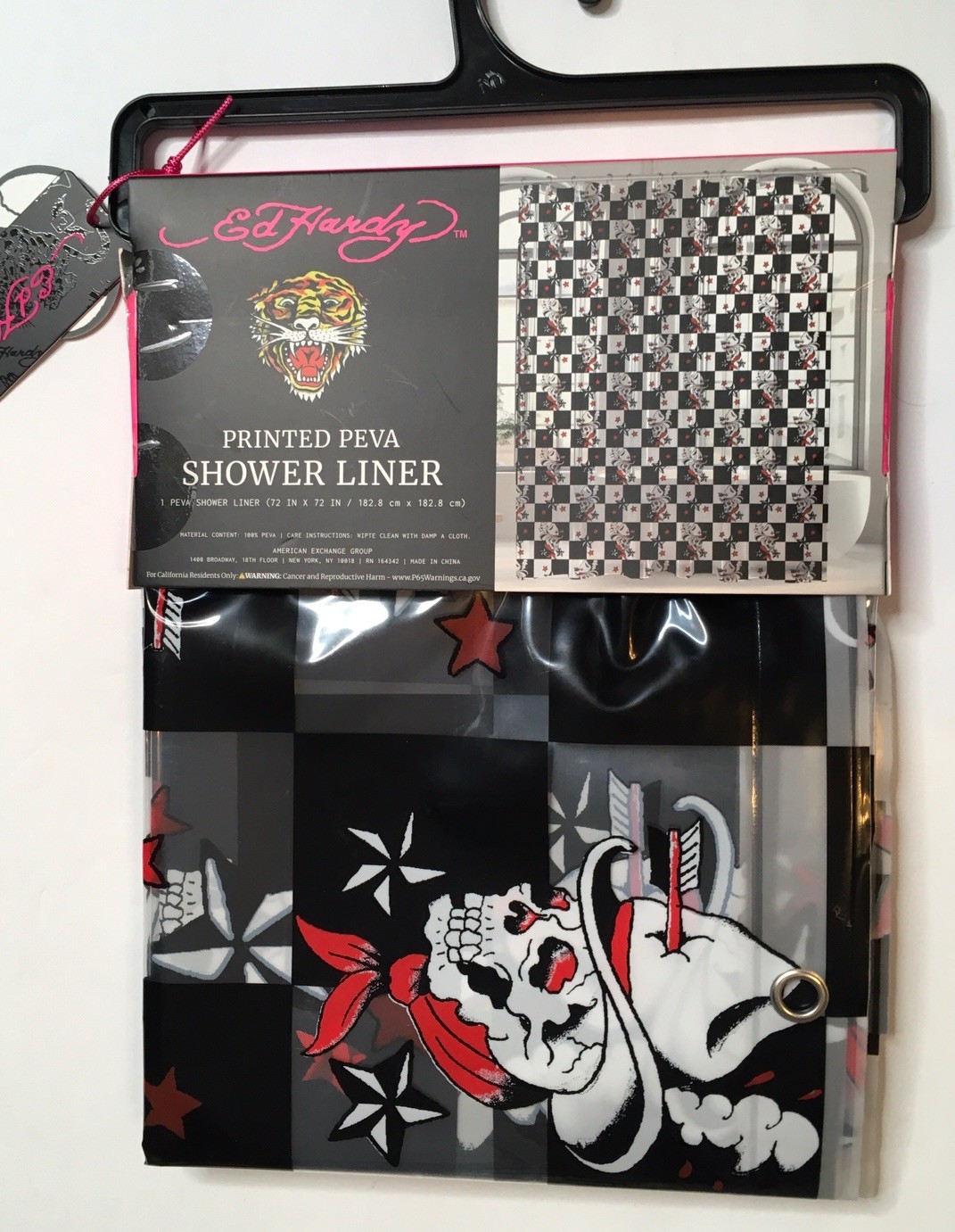 как выглядит ED HARDY SKULLS LOGO DESIGNS PRINTED PEVA SHOWER CURTAIN 72 X 72 NWT фото