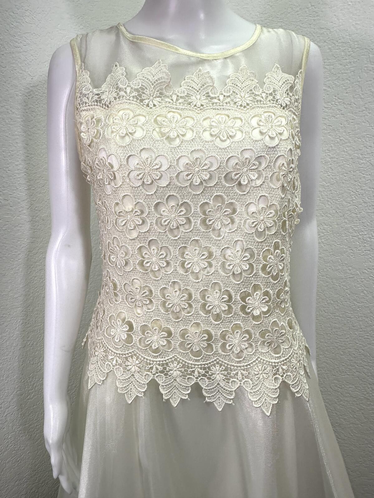 Vtg 1990s Sz M Ivory Fit Flare Tea Length Dress Wedding Bridal Organza Lace