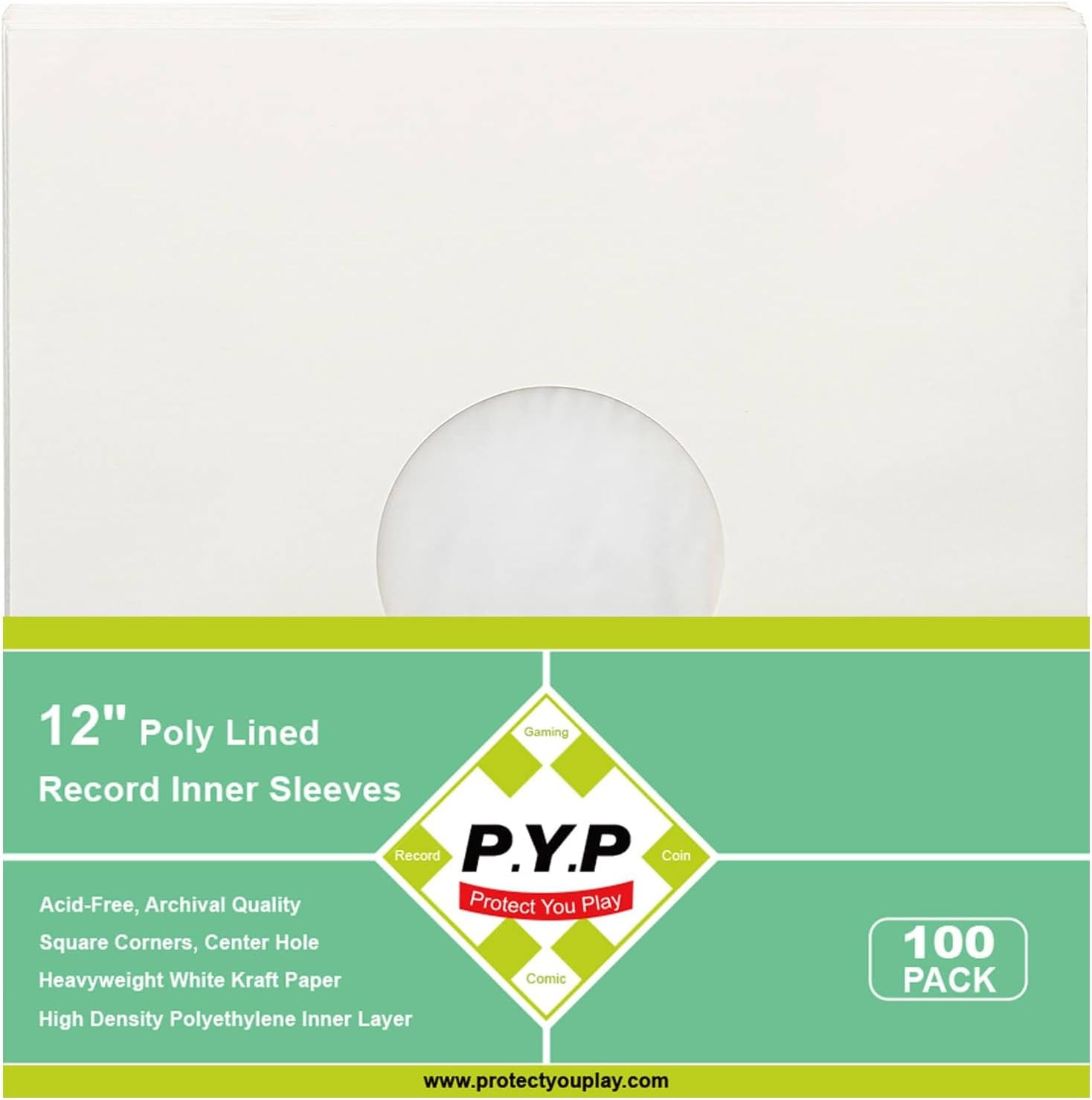 100Ct 12-Inch Poly-Lined Record Inner-Sleeves - White Kraft Paper for 33 RPM LP