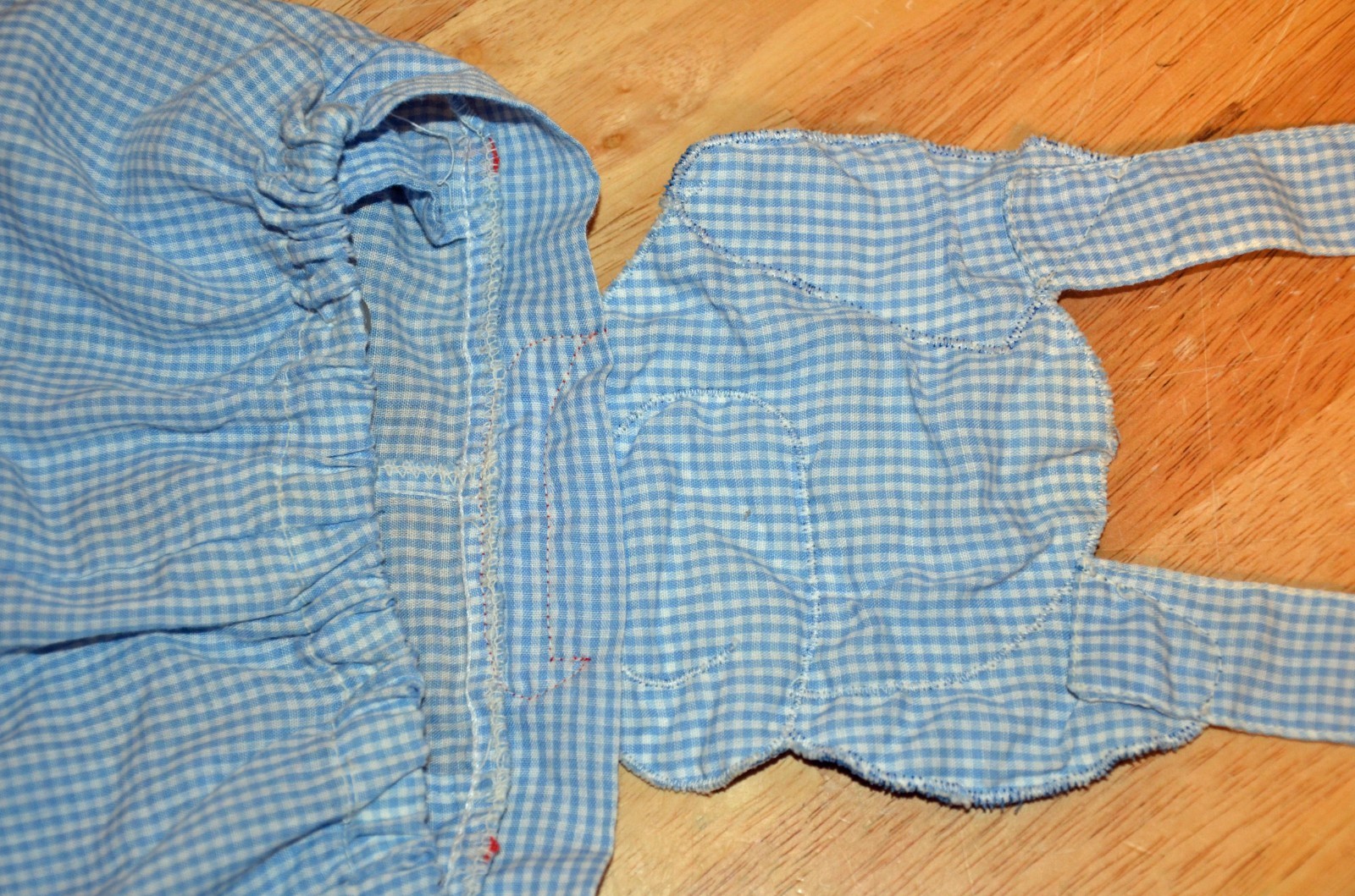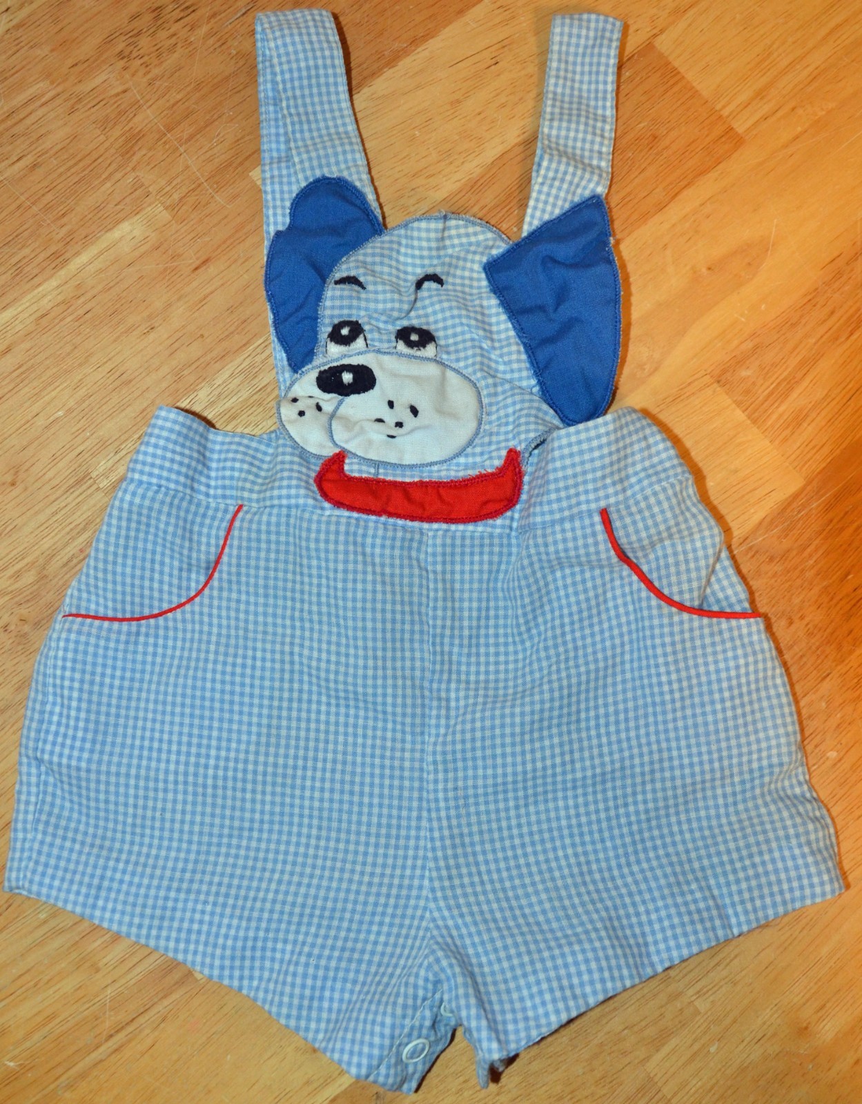 VTG Baby Infant Blue Checked Overalls w/ Puppy Dog Motif Hip Pockets Red Accents