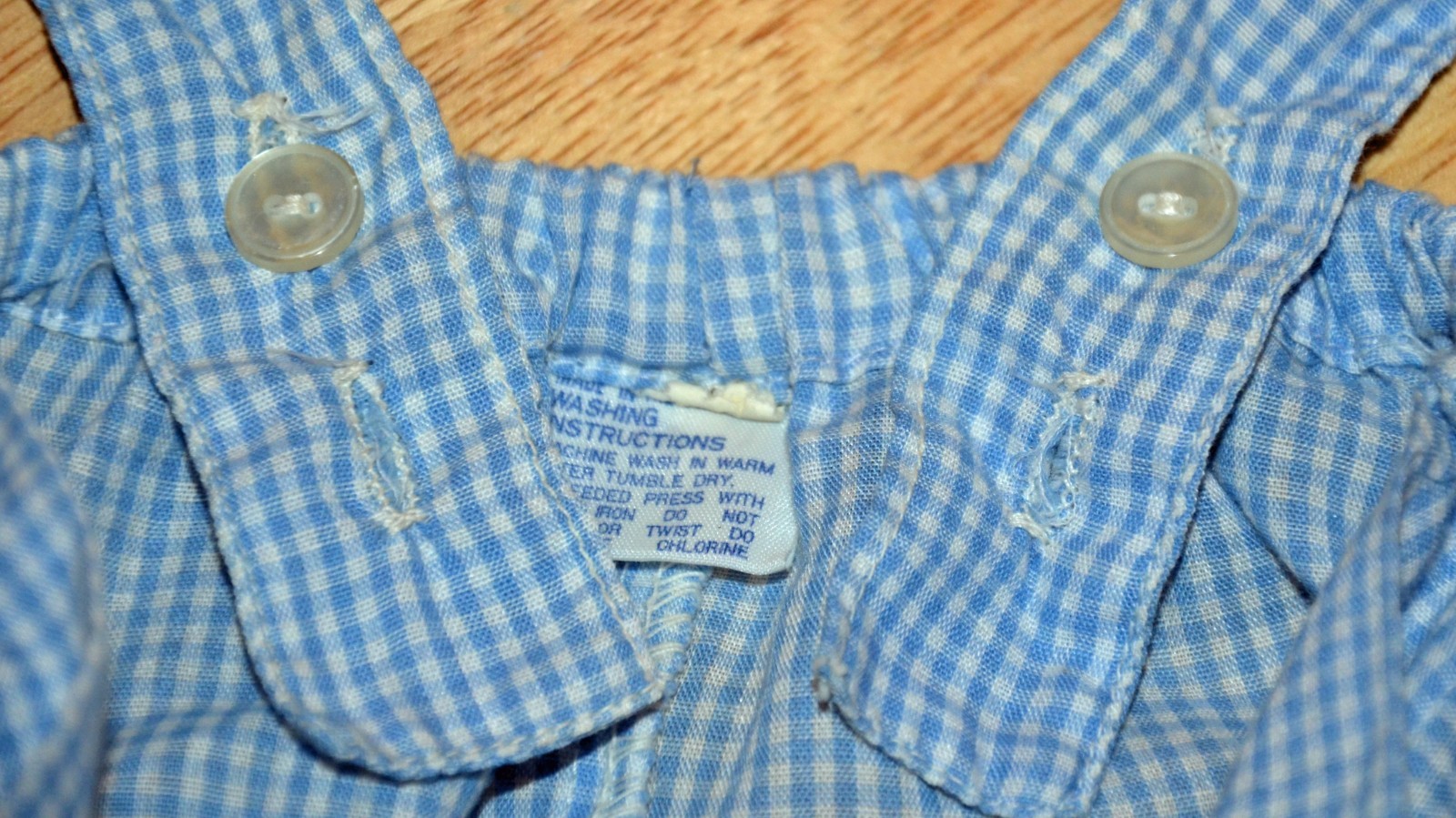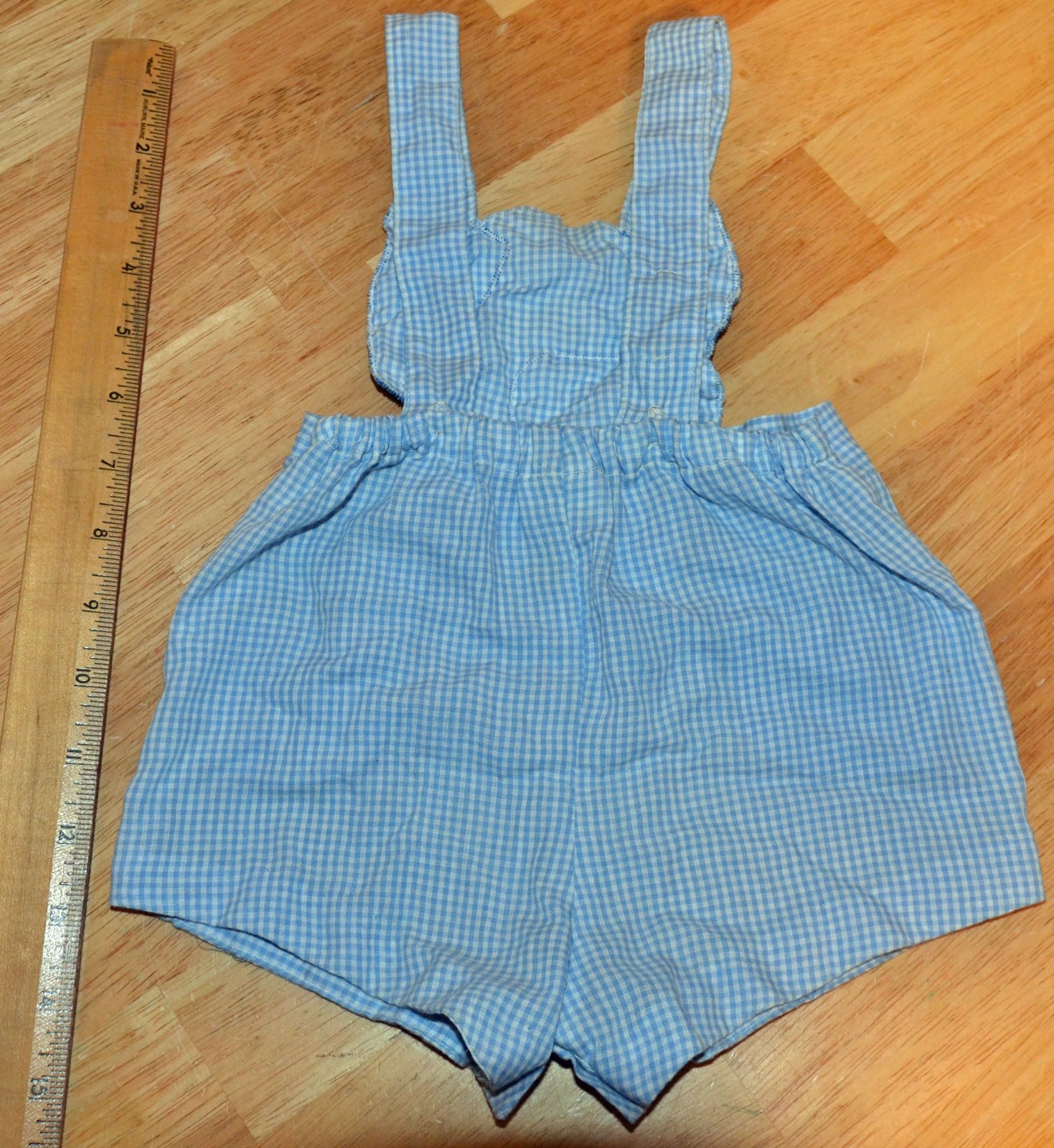 как выглядит VTG Baby Infant Blue Checked Overalls w/ Puppy Dog Motif Hip Pockets Red Accents фото