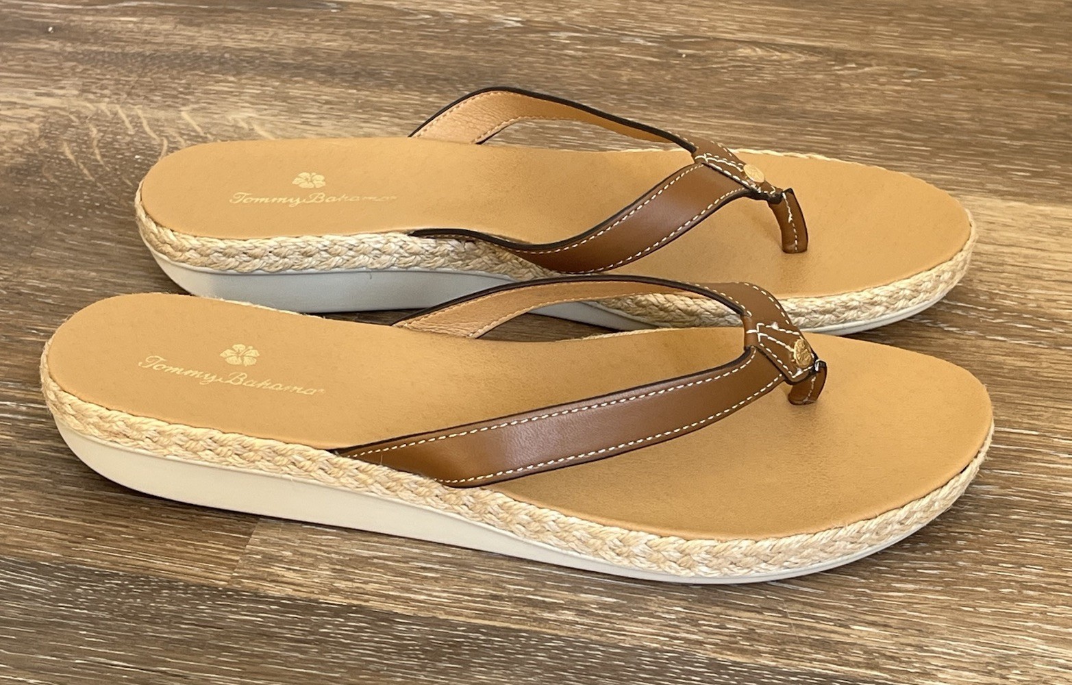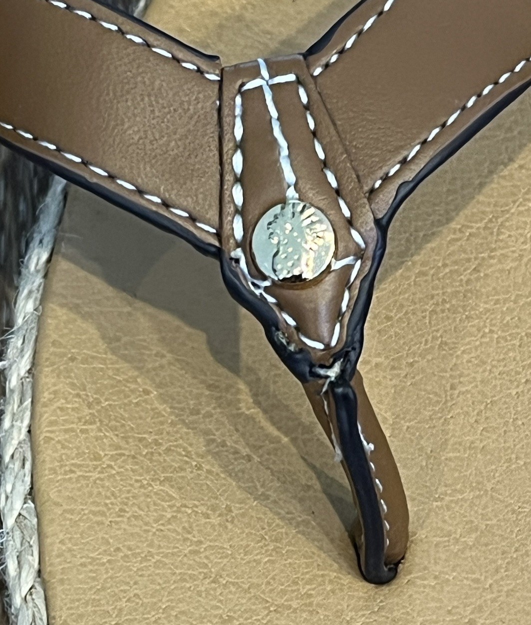 Tommy Bahama Tan Flip Flop Sandals Rope Border Gold Pineapple Accent Size 9 NEW