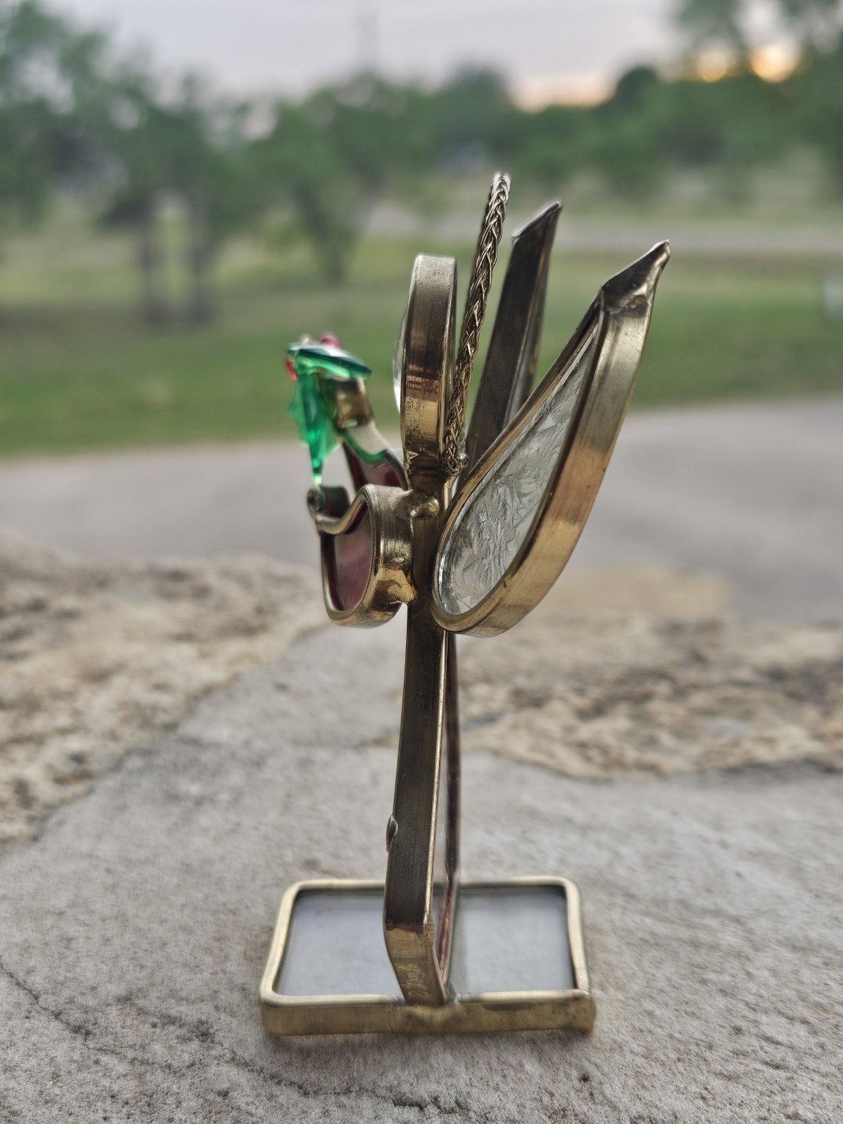 • VTG Red Stained Glass Textured Angel Holding Holly 4.5" Free Standing USA Made