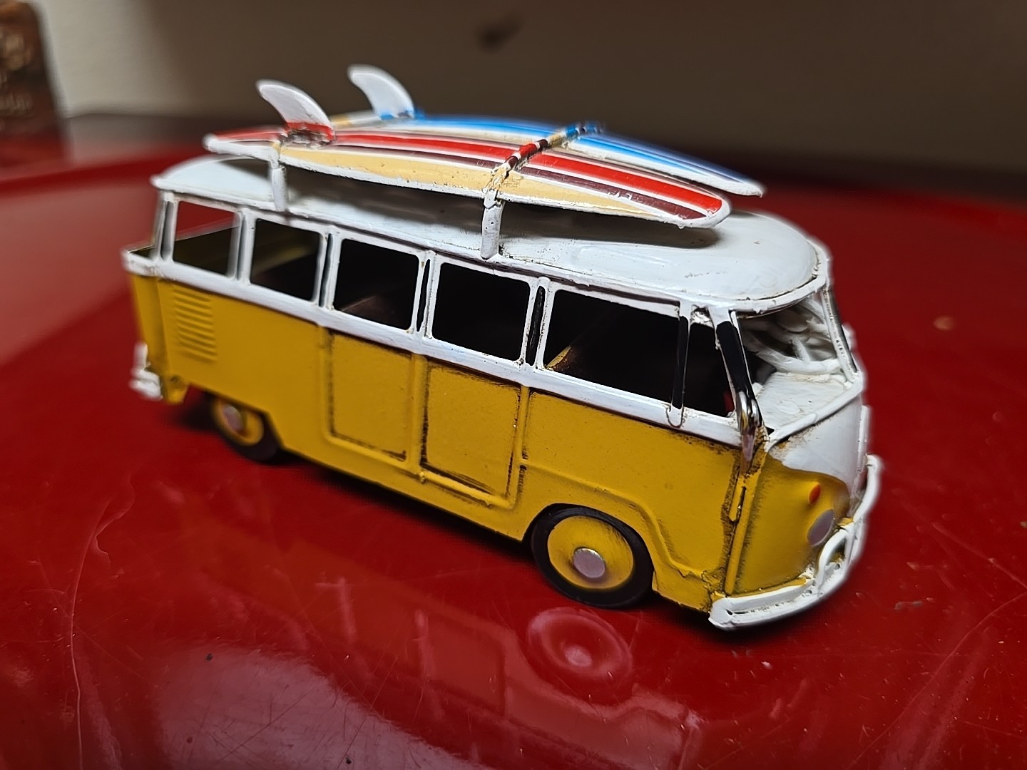 Volkwagon VW Kombi Type 2 Tin Metal Model Blue Beach Bus w/ Surfboards Roof Rack