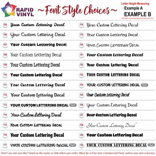 1. Enter Custom Text, Lettering, Numbers (Max Characters 20) 2. Enter Font # From Listing Images 3. Specify the maximum length we should not exceed if applicable |