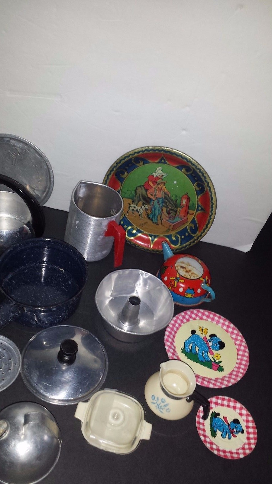 как выглядит Tin Litho CHILDRENS Doll Dishes COOKWARE PANS Cutlery Tea Huge Lot 68 Pcs Toy фото