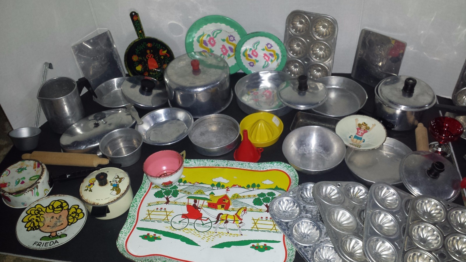 Tin Litho CHILDREN'S Doll Dishes COOKWARE PANS Cutlery Tea Huge Lot 68 Pcs Toy