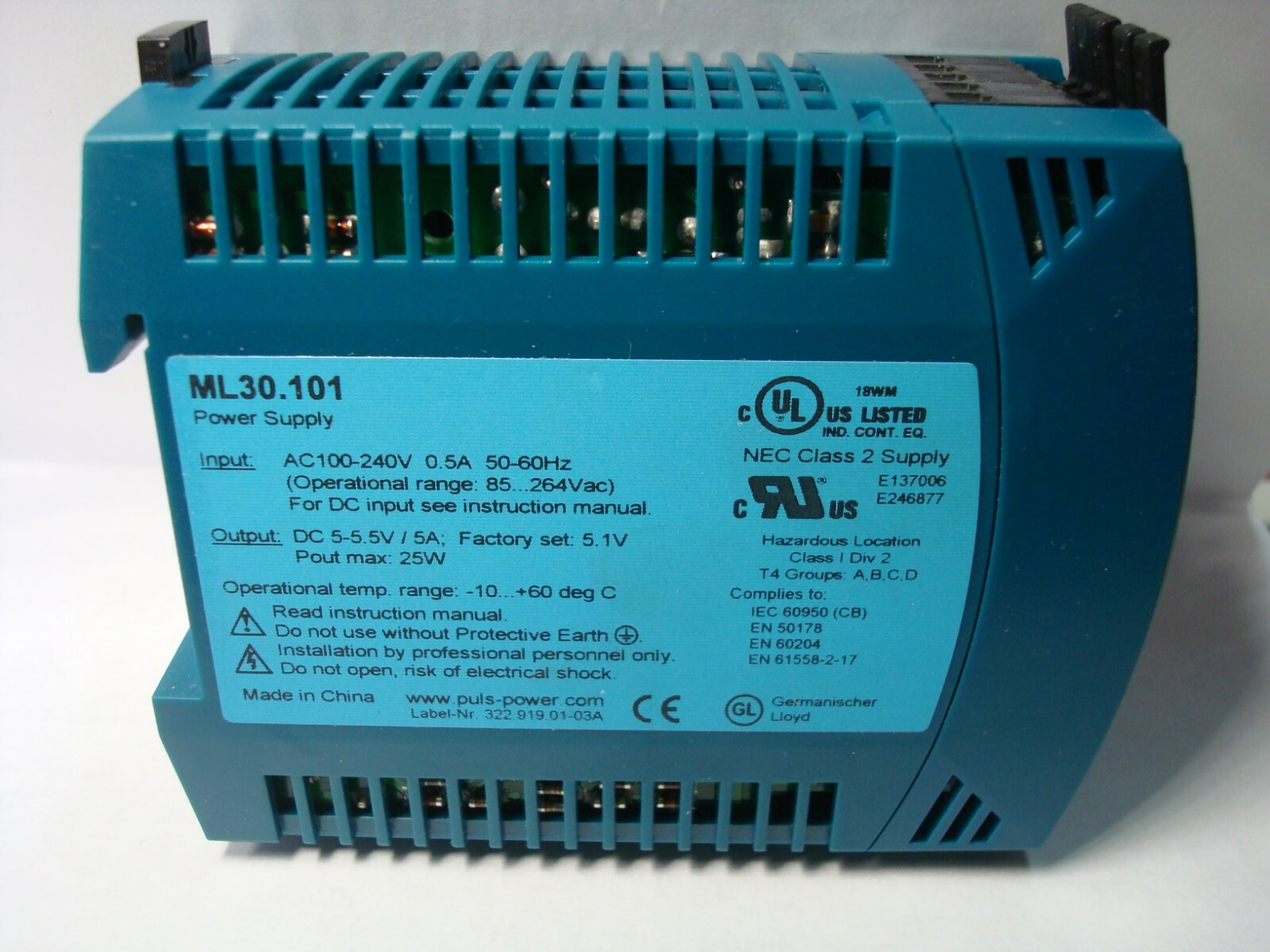PULS ML30.101 POWER SUPPLY 25 WATT 100-240VAC INPUT 5-5.5VDC OUTPUT