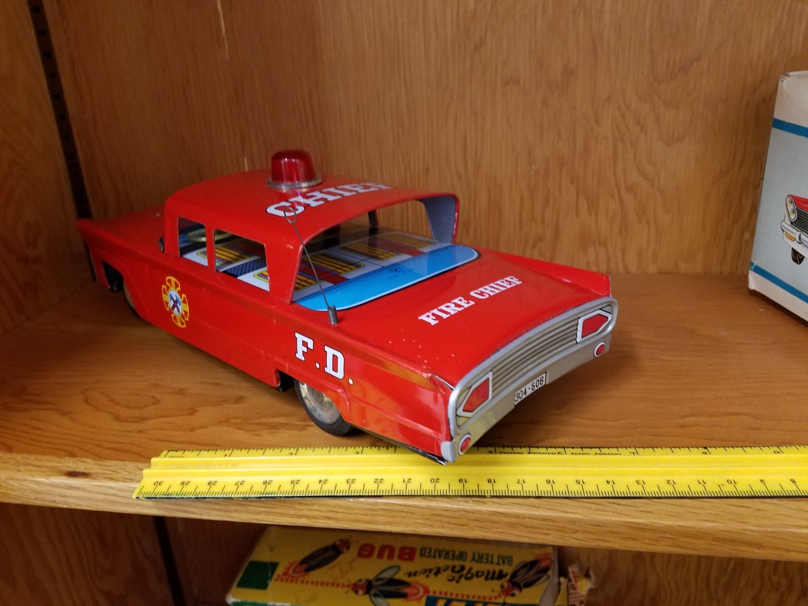 как выглядит Vintage Yonezawa Tin Battery OP Fire Chief Car Made In Japan In Box Tin Toy Lot фото