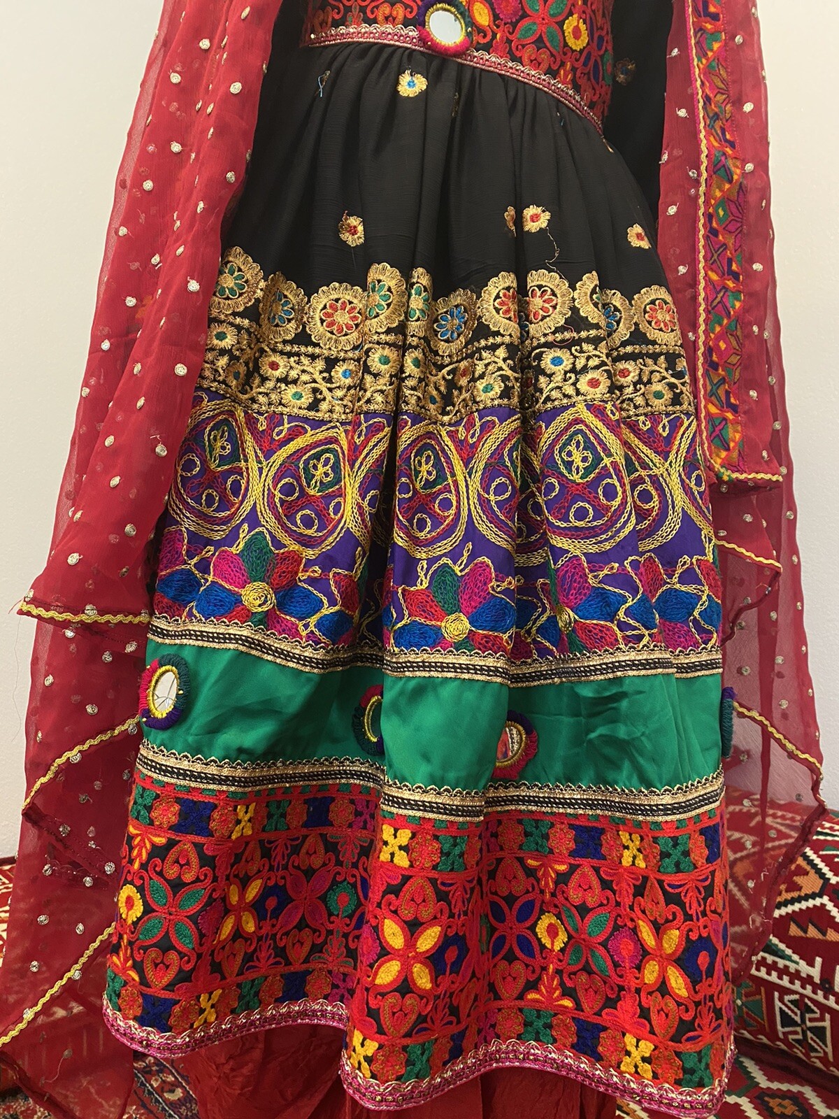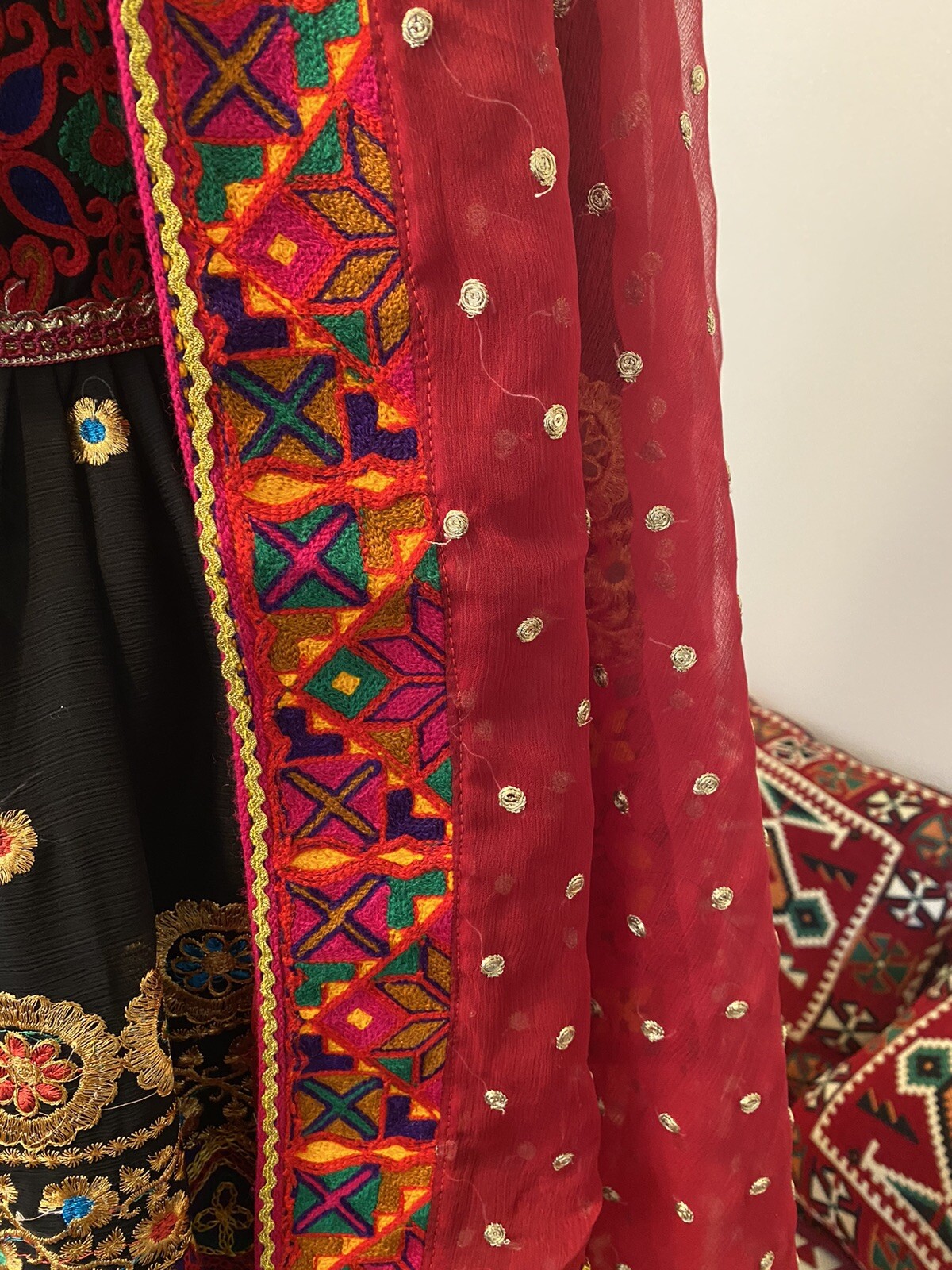 как выглядит Afghan Black Dress With Red Pant And Red Scarf Large Size фото