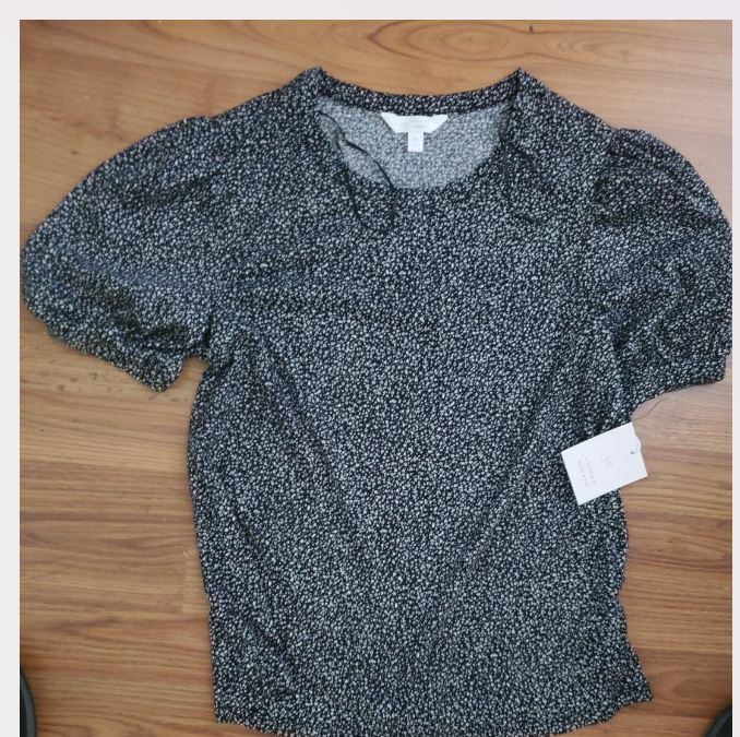 как выглядит Black w white lil flowers size Med Lauren Conrad puff top Polyester/Spandex 21" фото