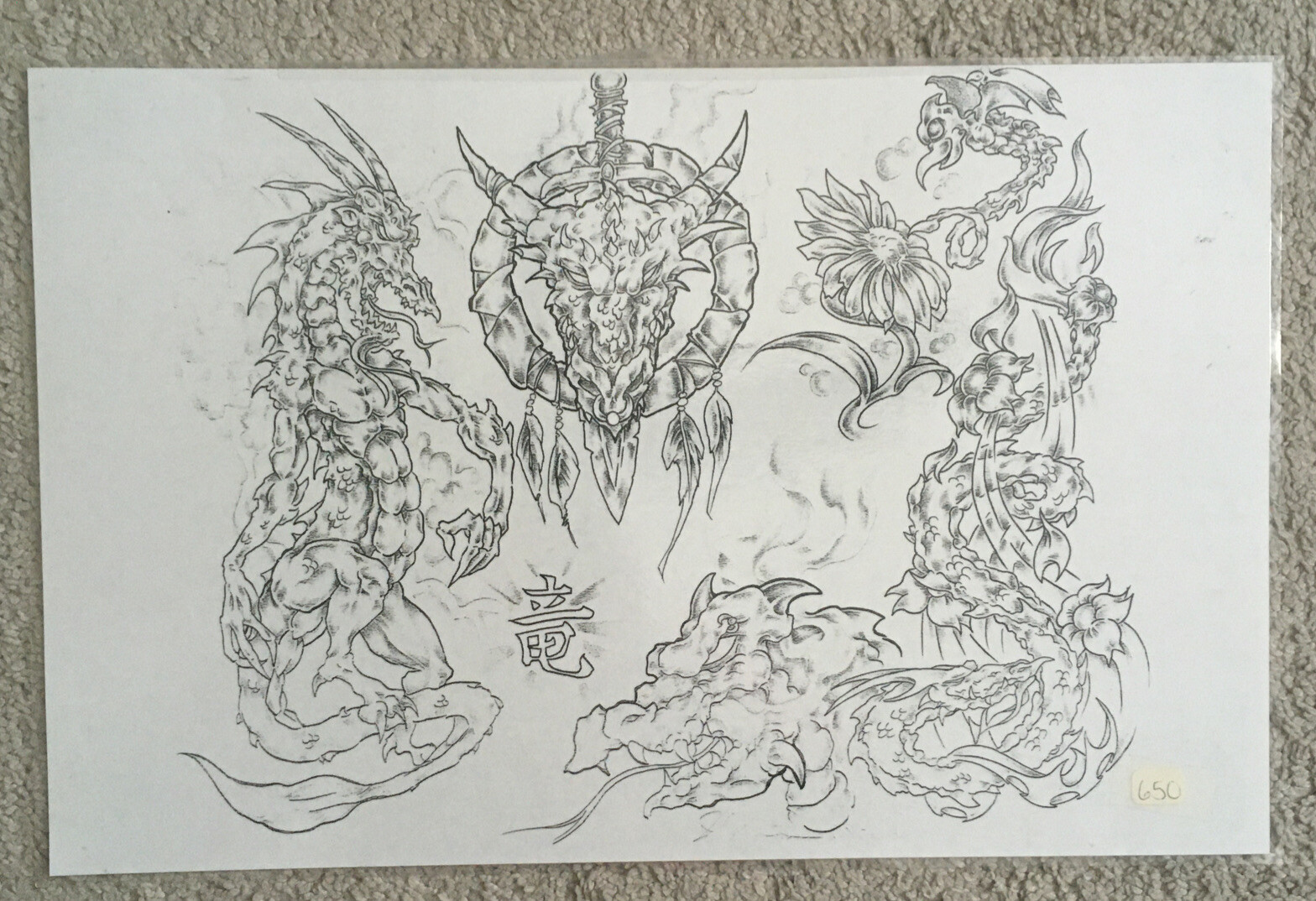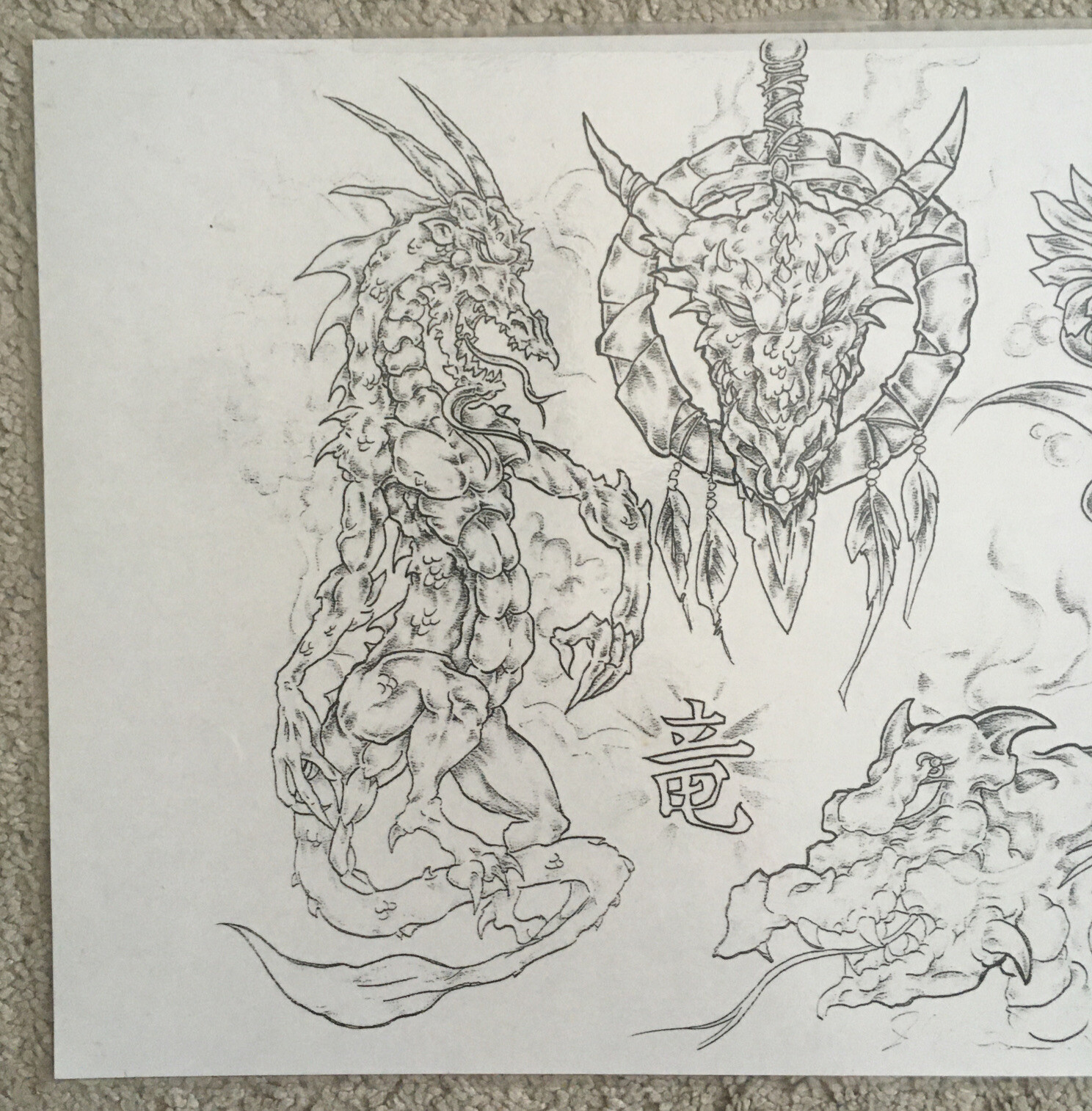 Tattoo Flash Single Sheet Print Dragons Dreamcatcher Flowers Fire Bird 11 X 14