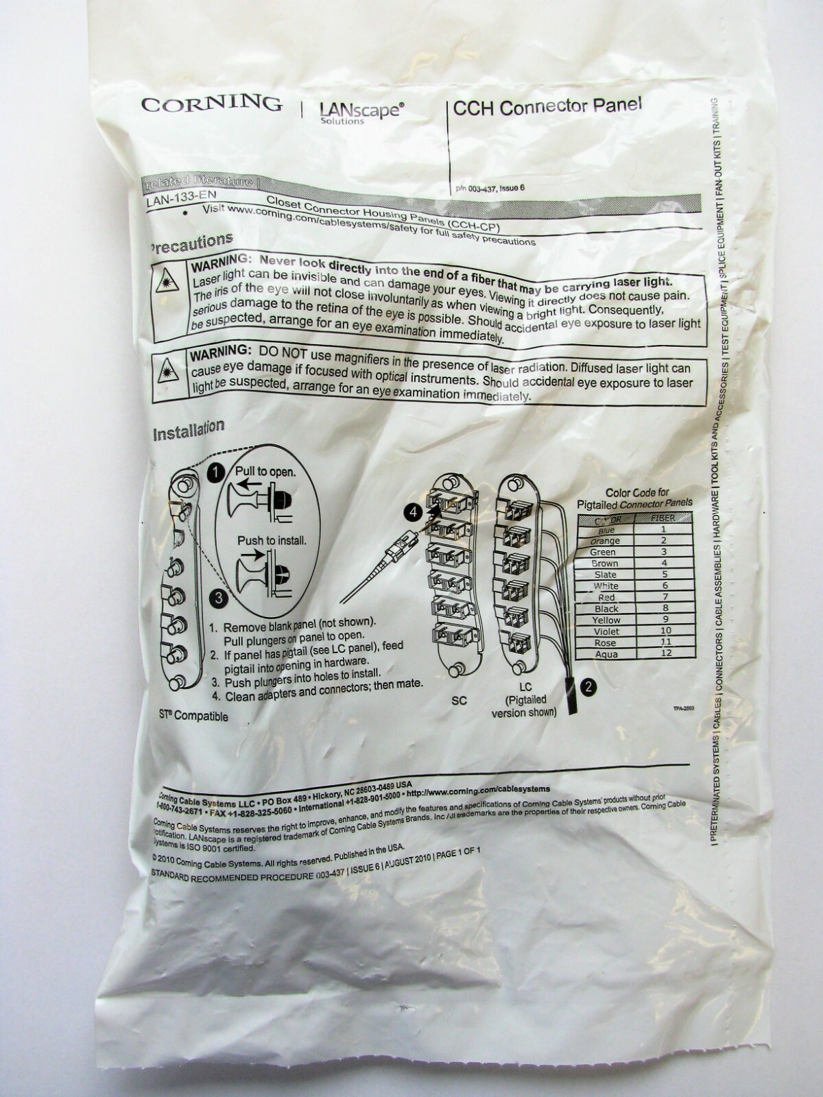 Corning CCH-CP06-19T Panel ST Singlemode/SM, Simplex, 6 Fiber OS2, UPC