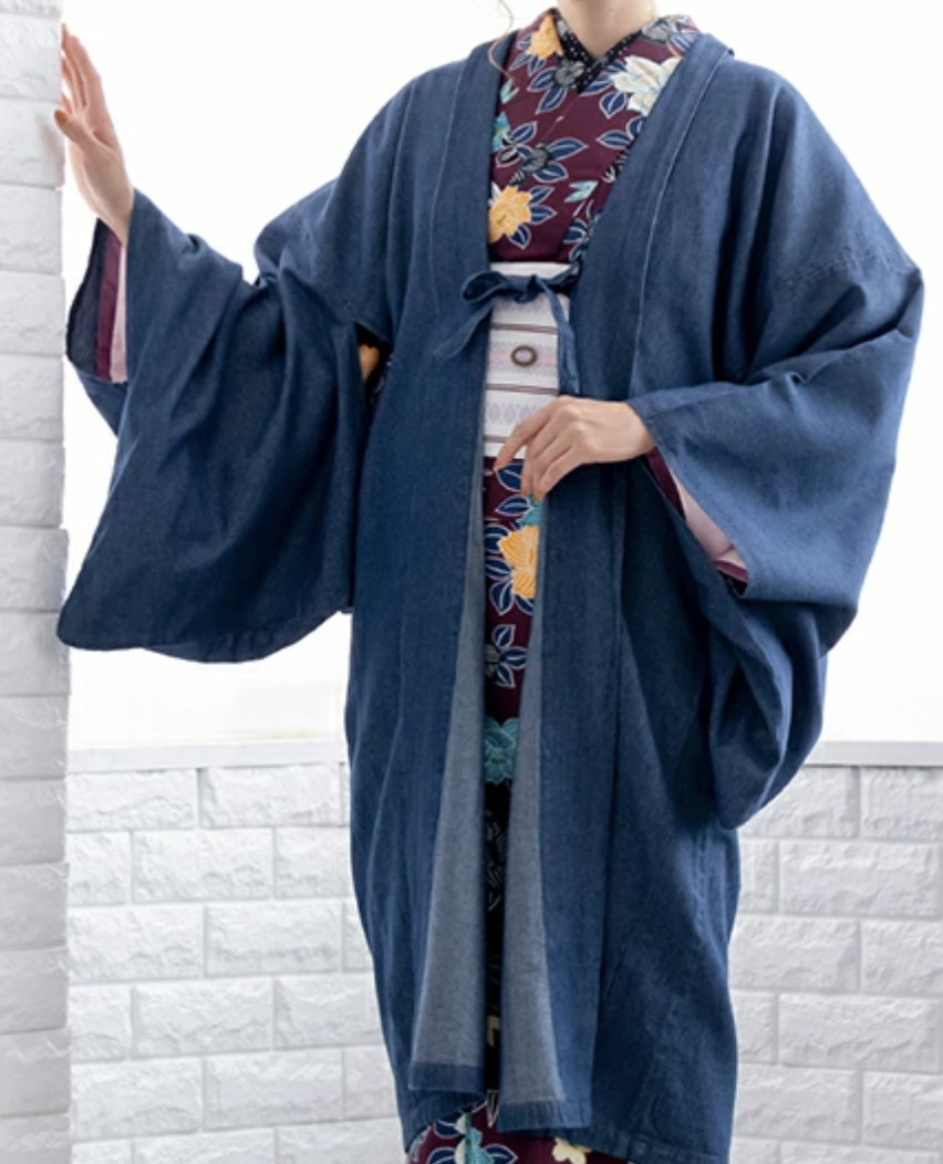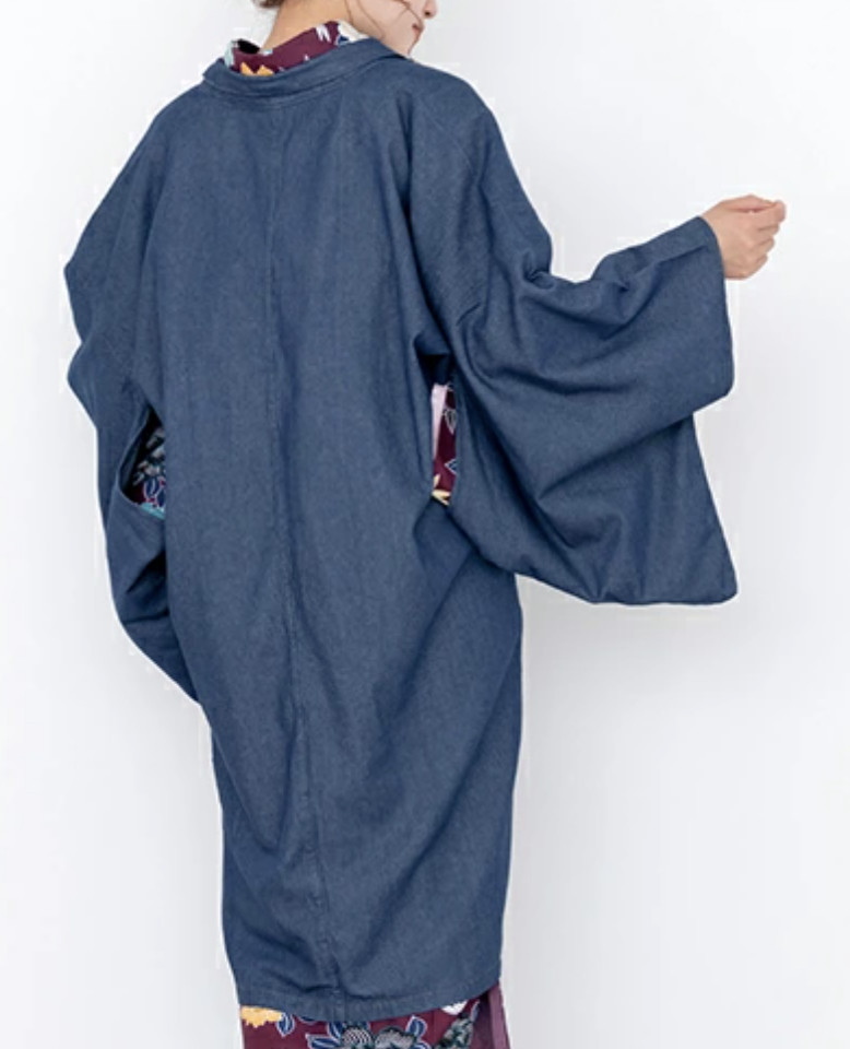 Japanese Women's Traditional Kimono Denim Haori Long Coat Jacket Indigo