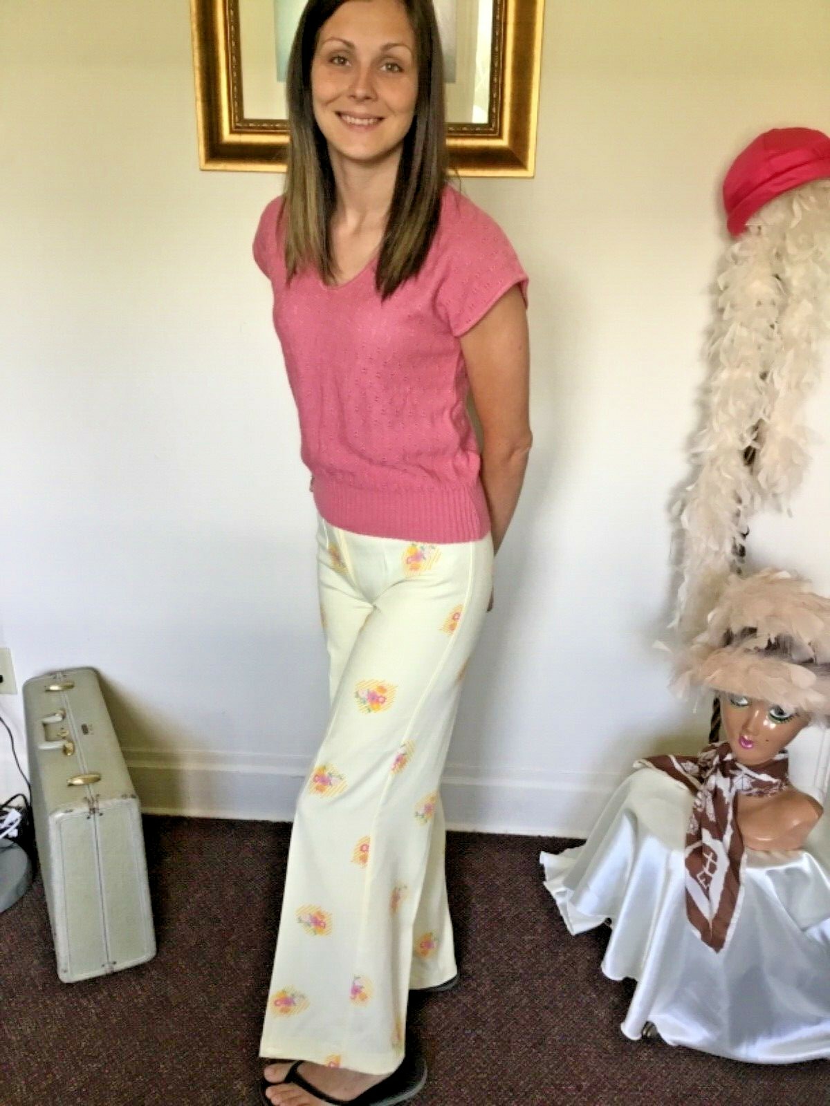 как выглядит 70s Vintage Yellow Hippie Pink Floral Hi-Waist Bell Bottom Pants фото