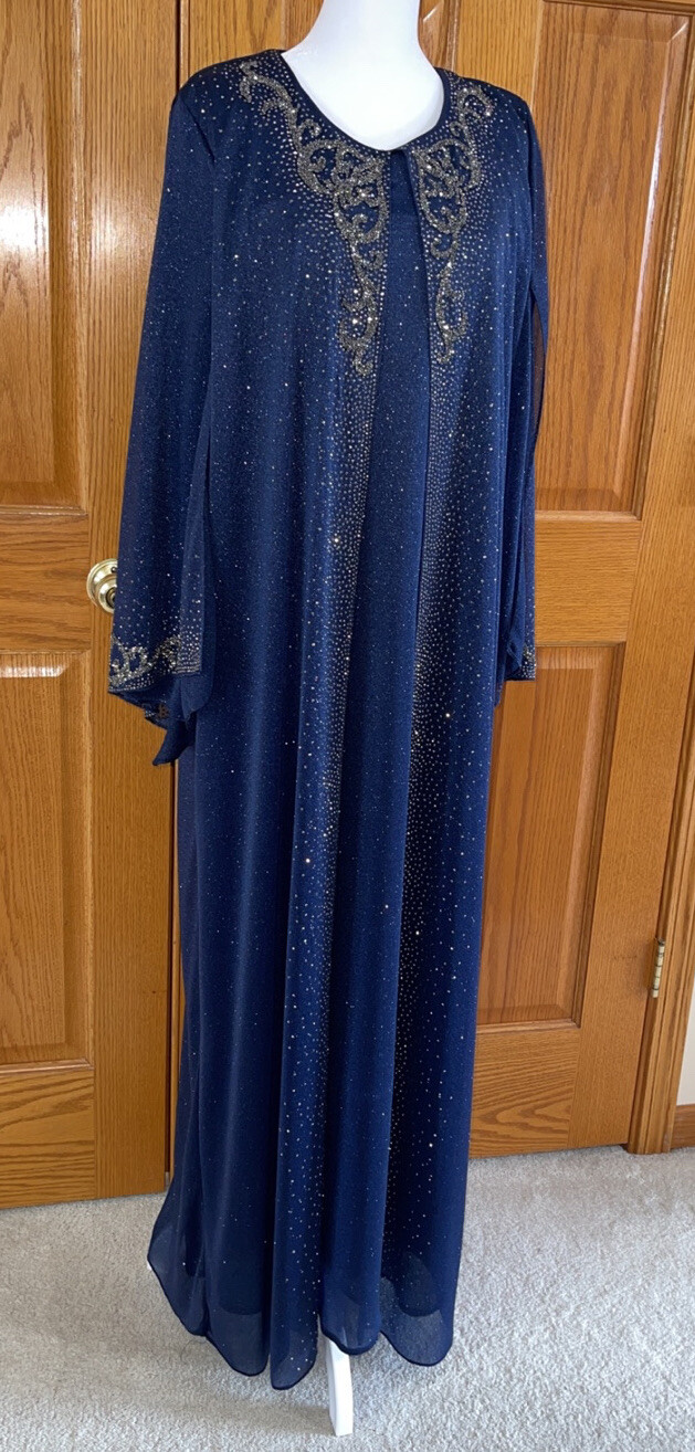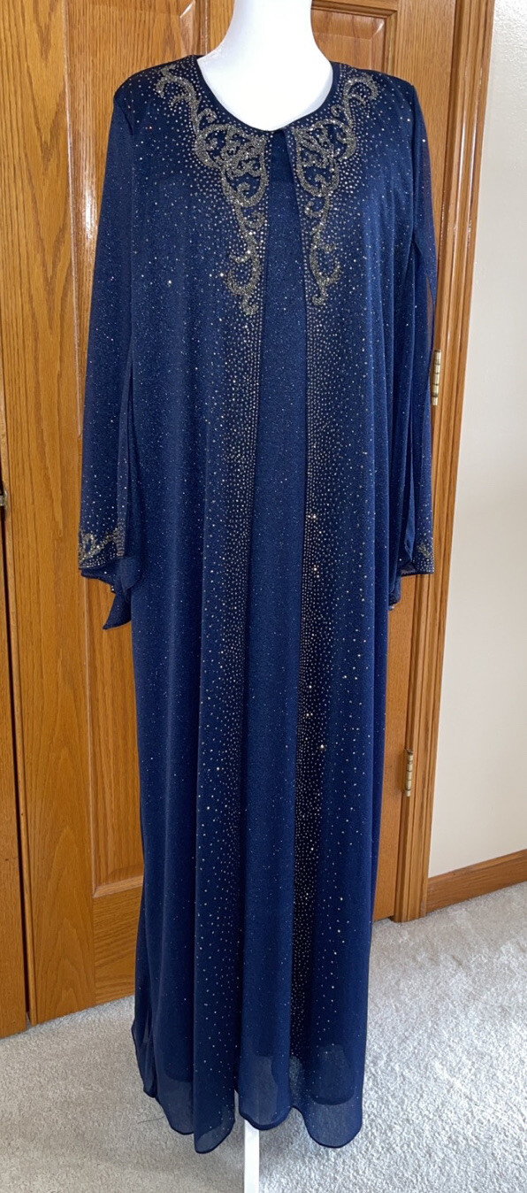 Formal Dress Kaftan Plus Size 24W Navy Overy lay Glitter Beads Long Sleeves Maxi