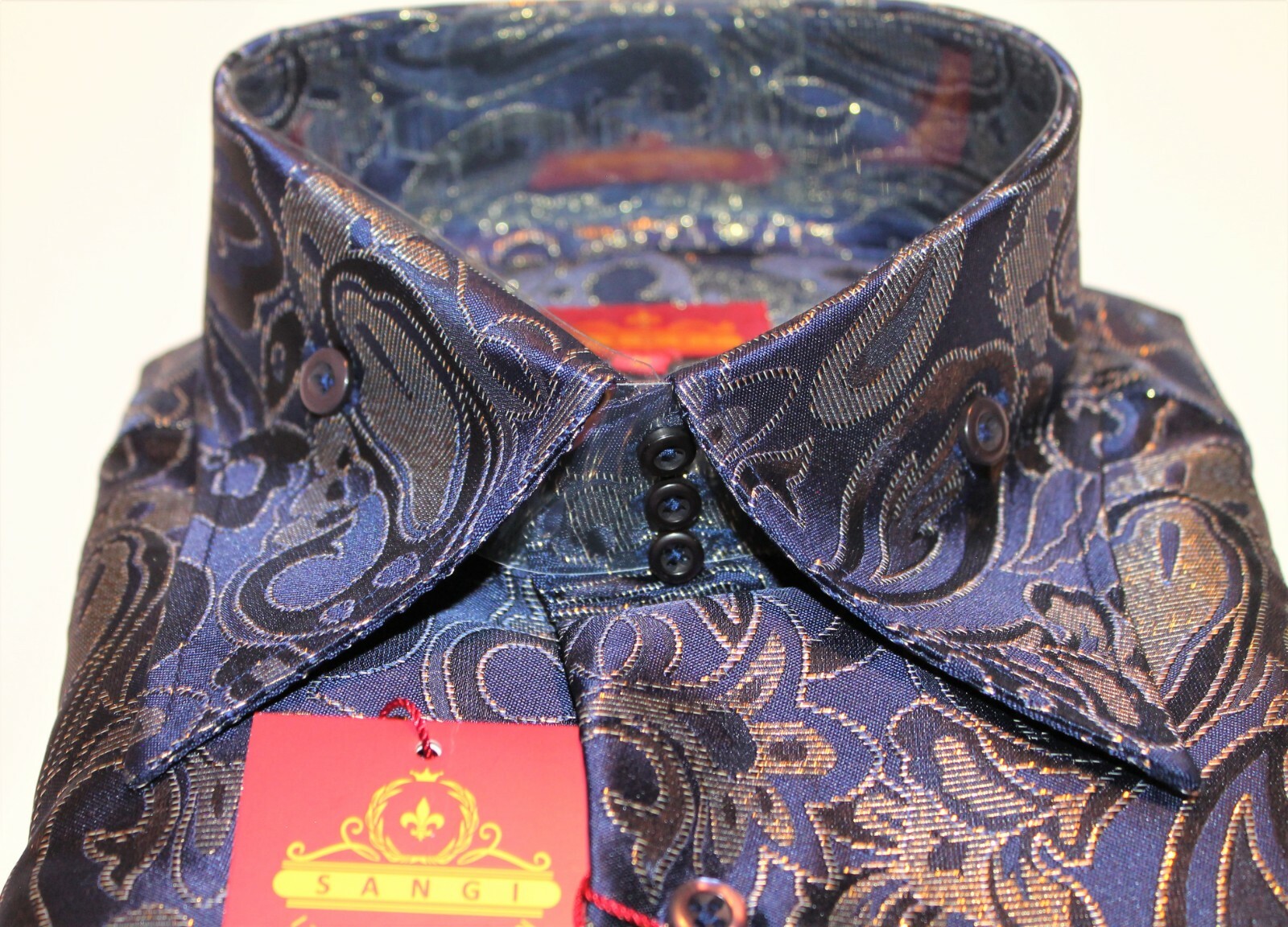 Mens Sophisticated Navy Blue Gold Paisley High Collar FC Shirt SANGI TUSCANY P41