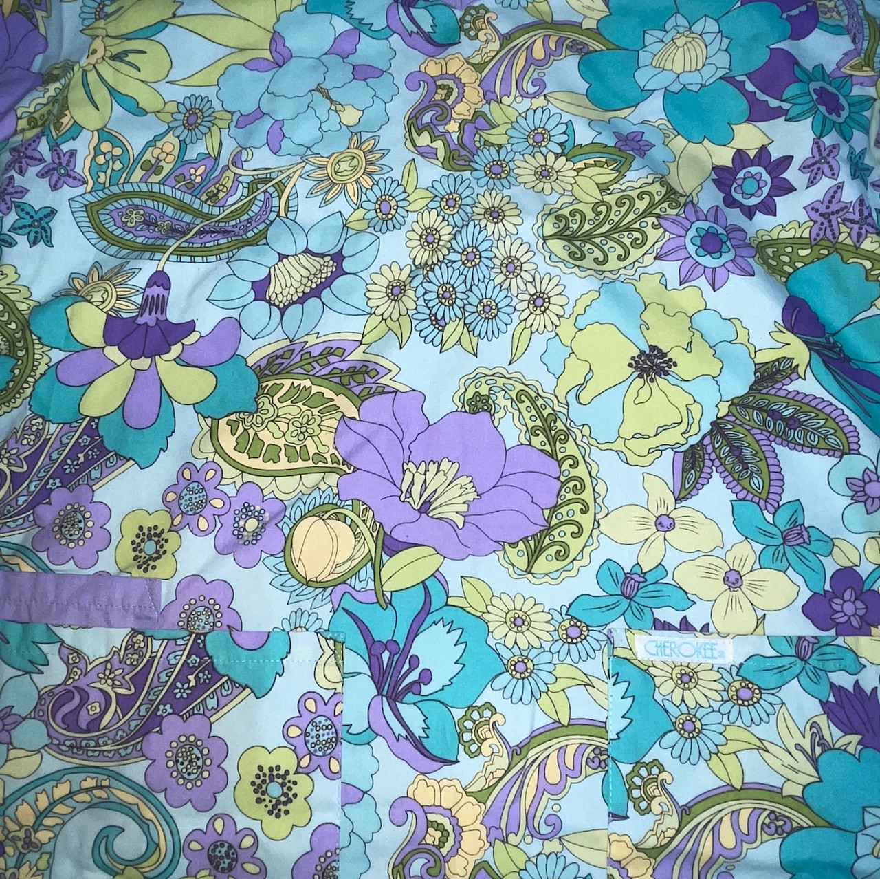 как выглядит Cherokee Women Scrub Shirt Purple Teal Floral Paisley Size XS Extra Small Nurse фото