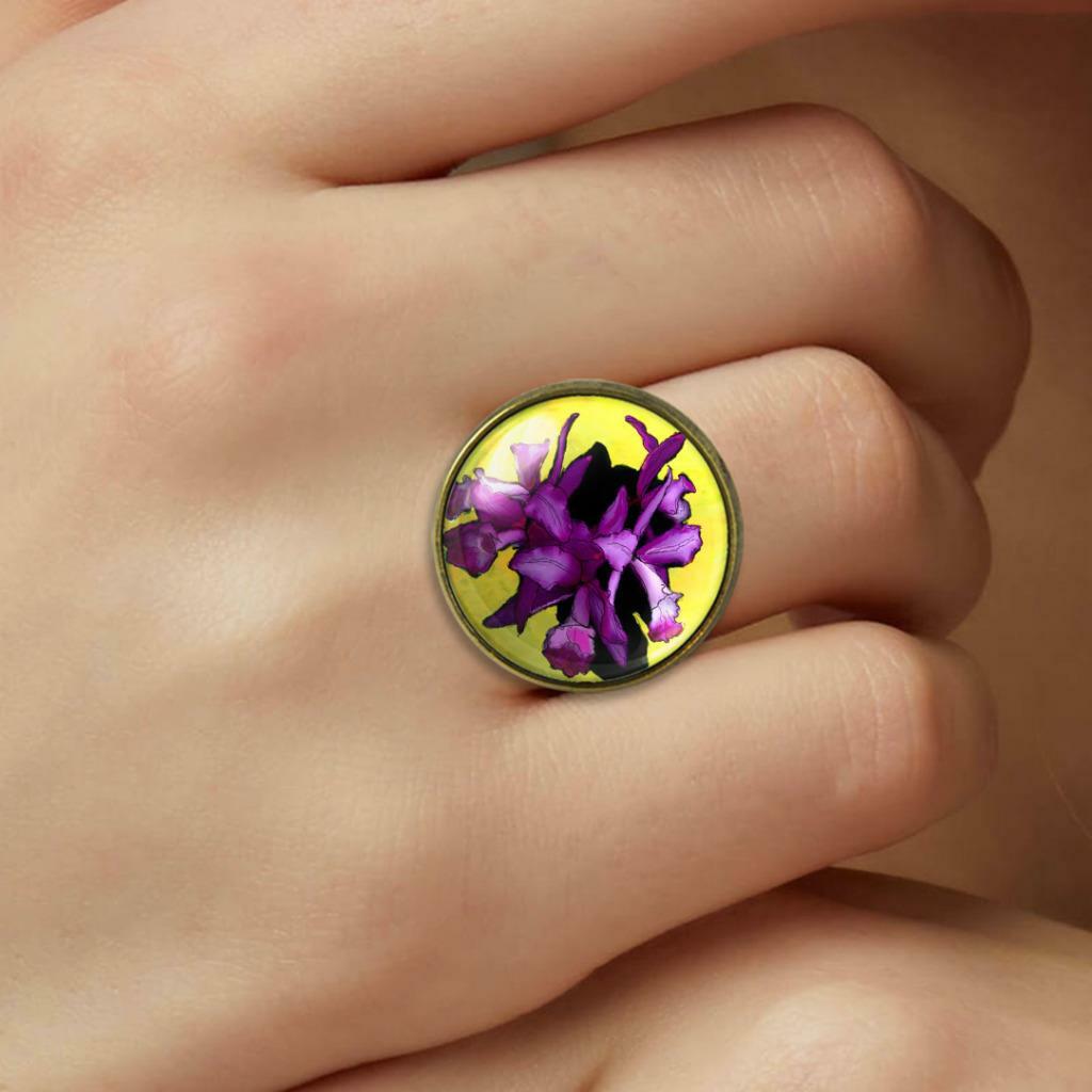 как выглядит Purple Orchid Ring - Flower Painting Handmade Adjustable Bronze Glass Ring фото