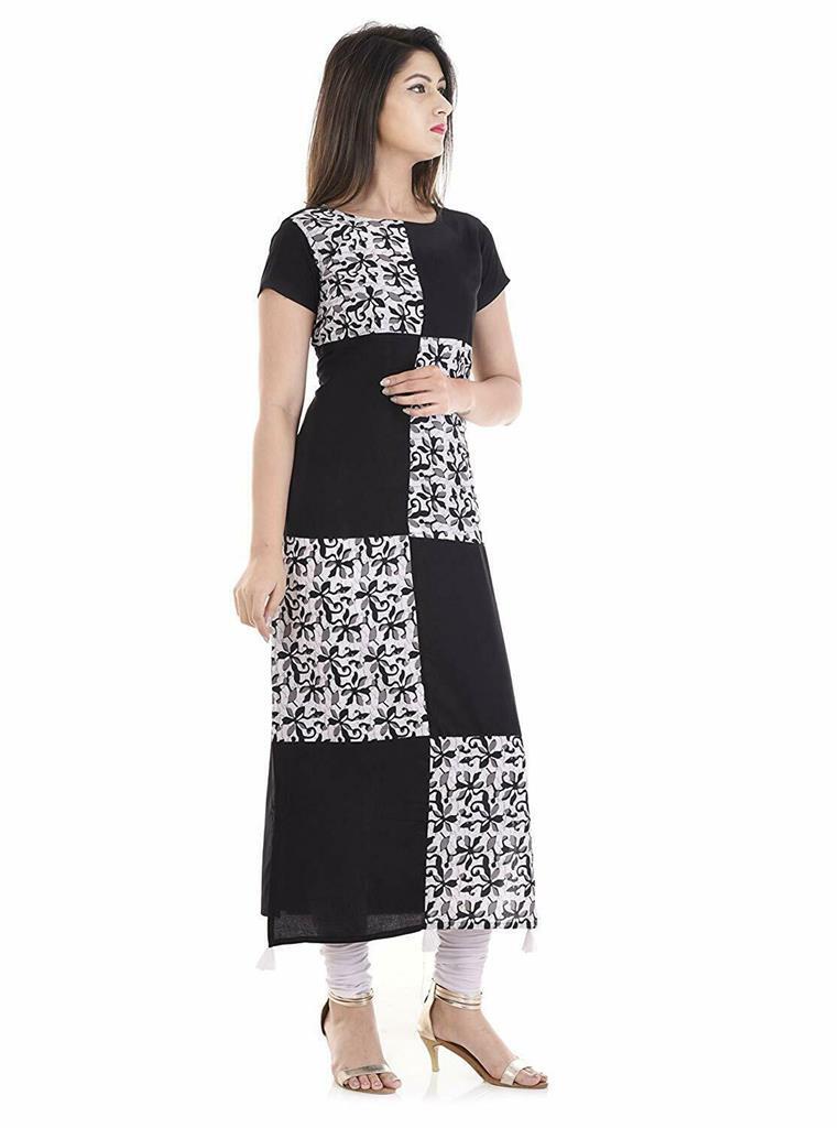Designer Patchwork White Black Rayon Printed Kurti Straight fit