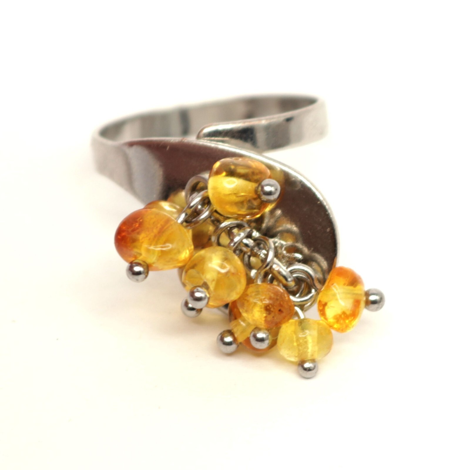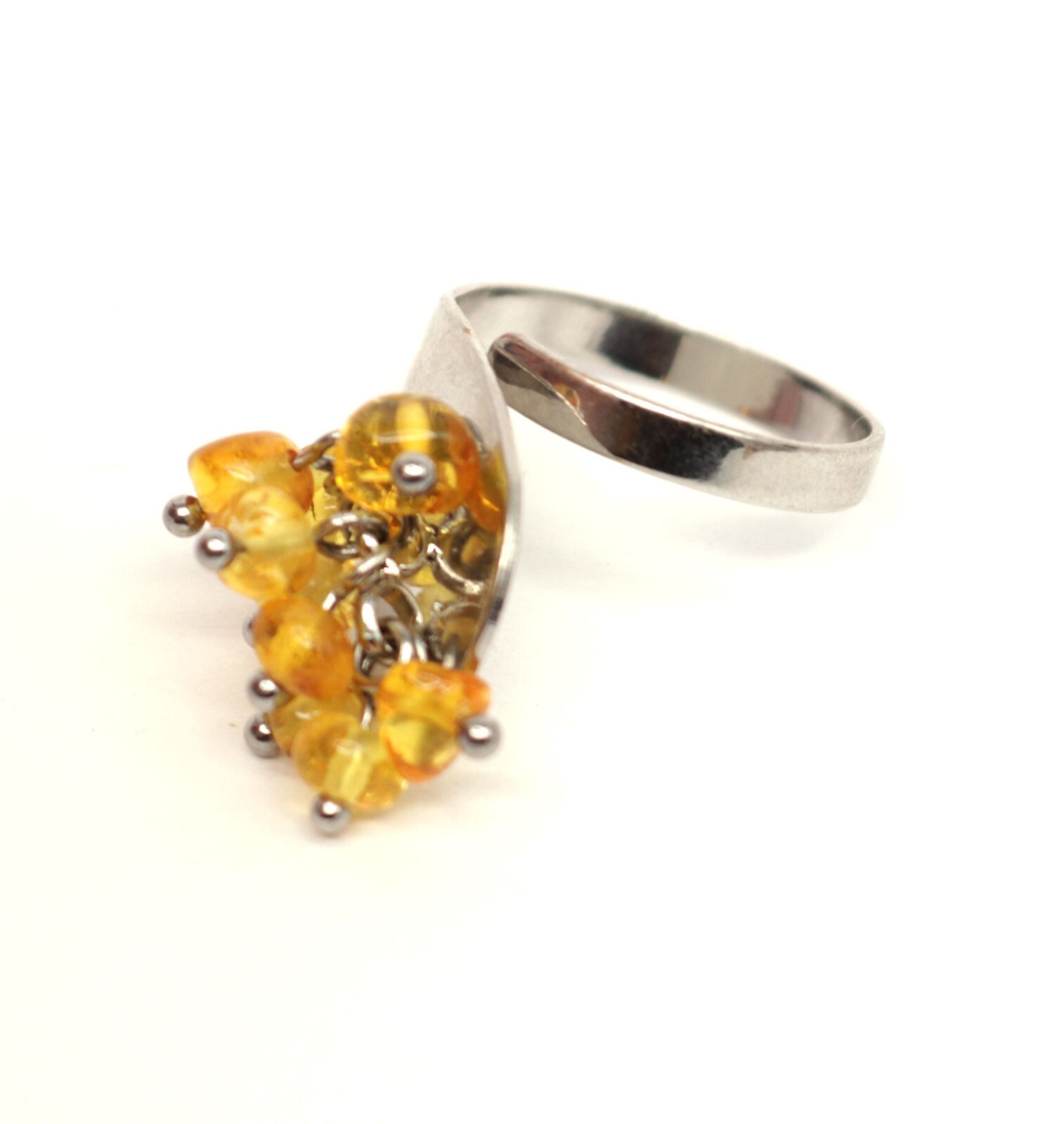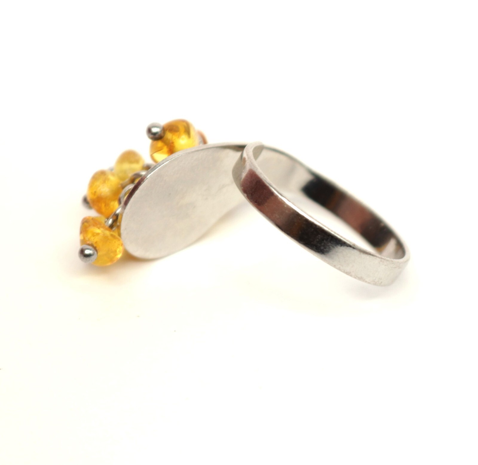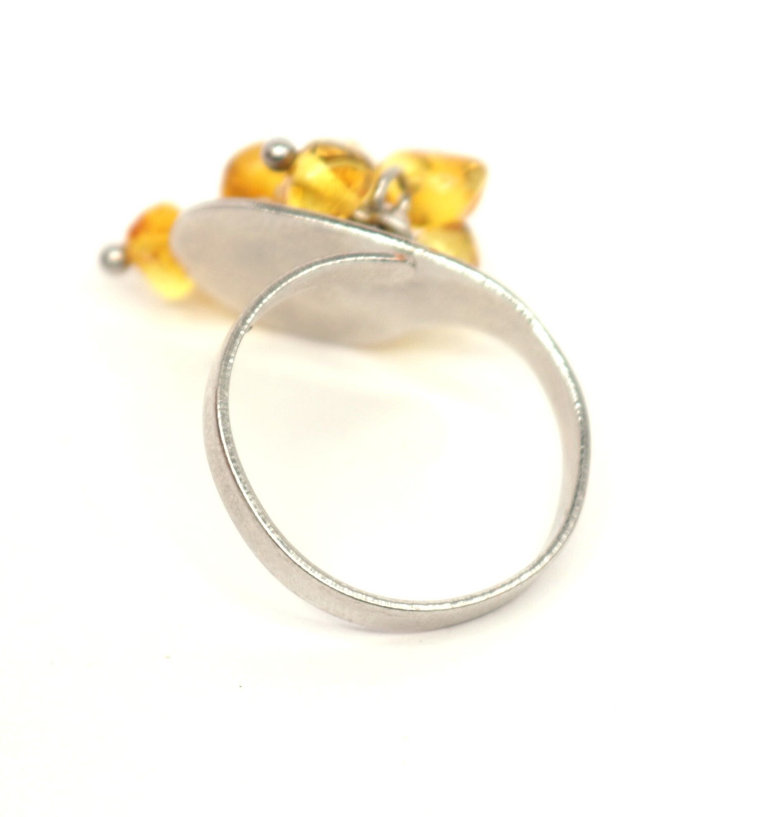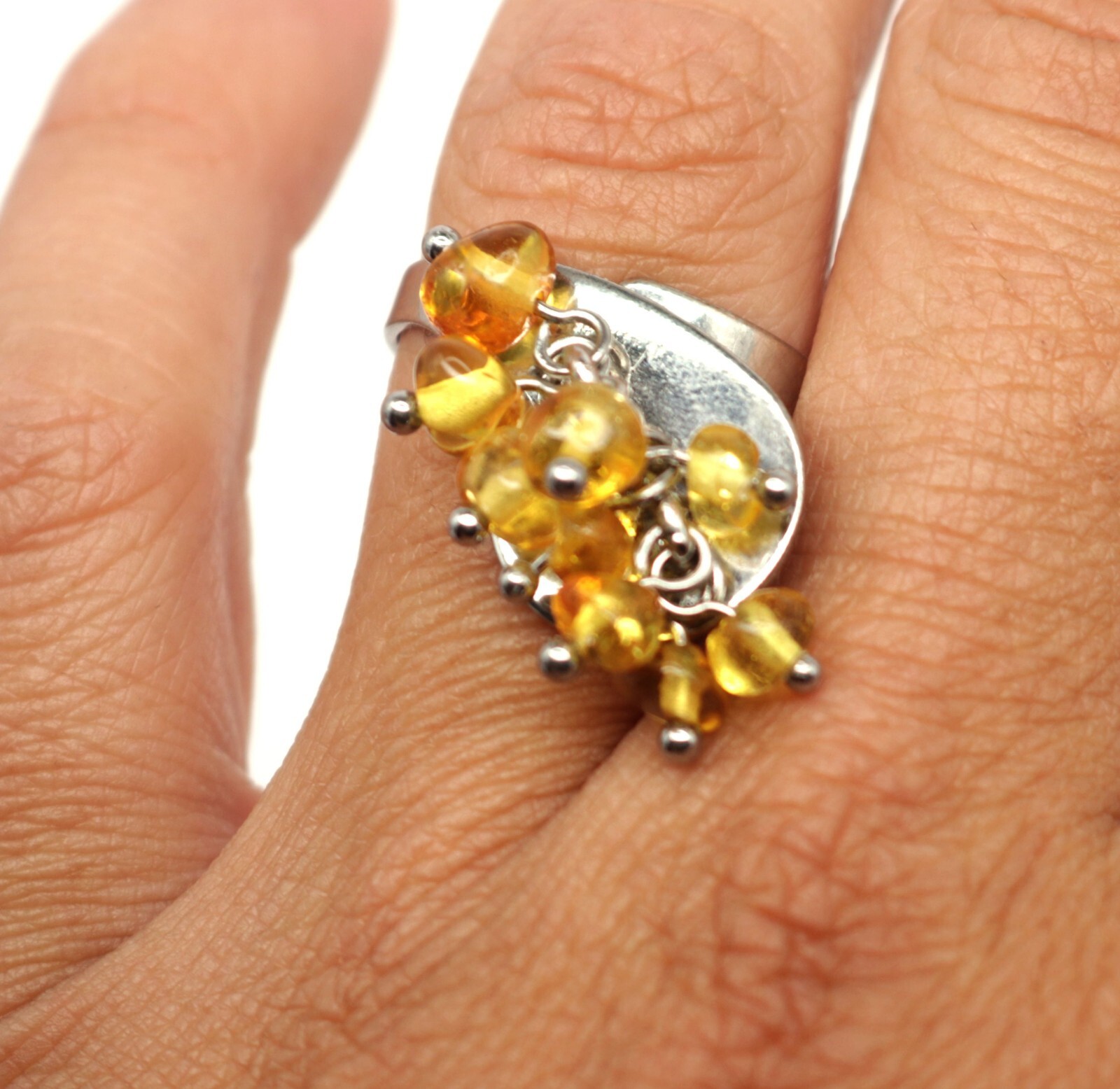 Silver Color Ring With Honey Baltic Amber - Adjustable