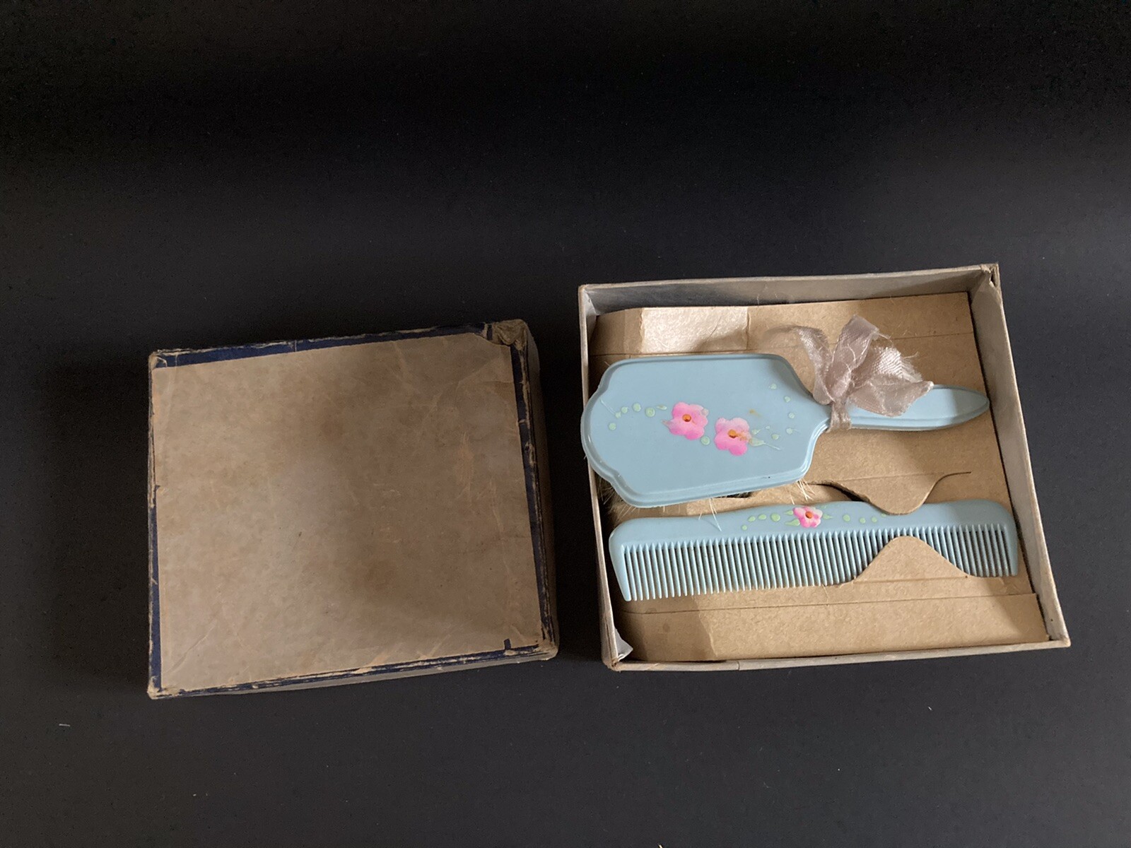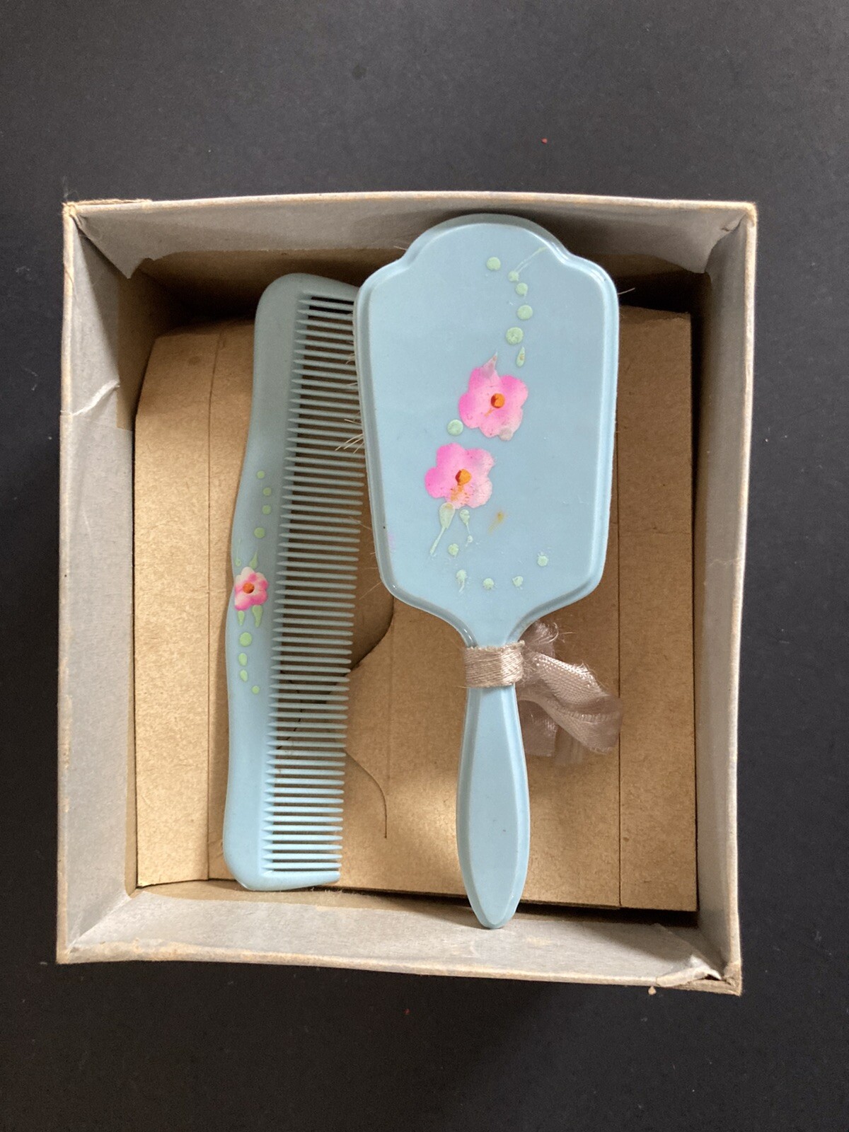 • Antique Celluloid Baby or Child Brush and Comb Set Handpainted Flowers BLUE USA