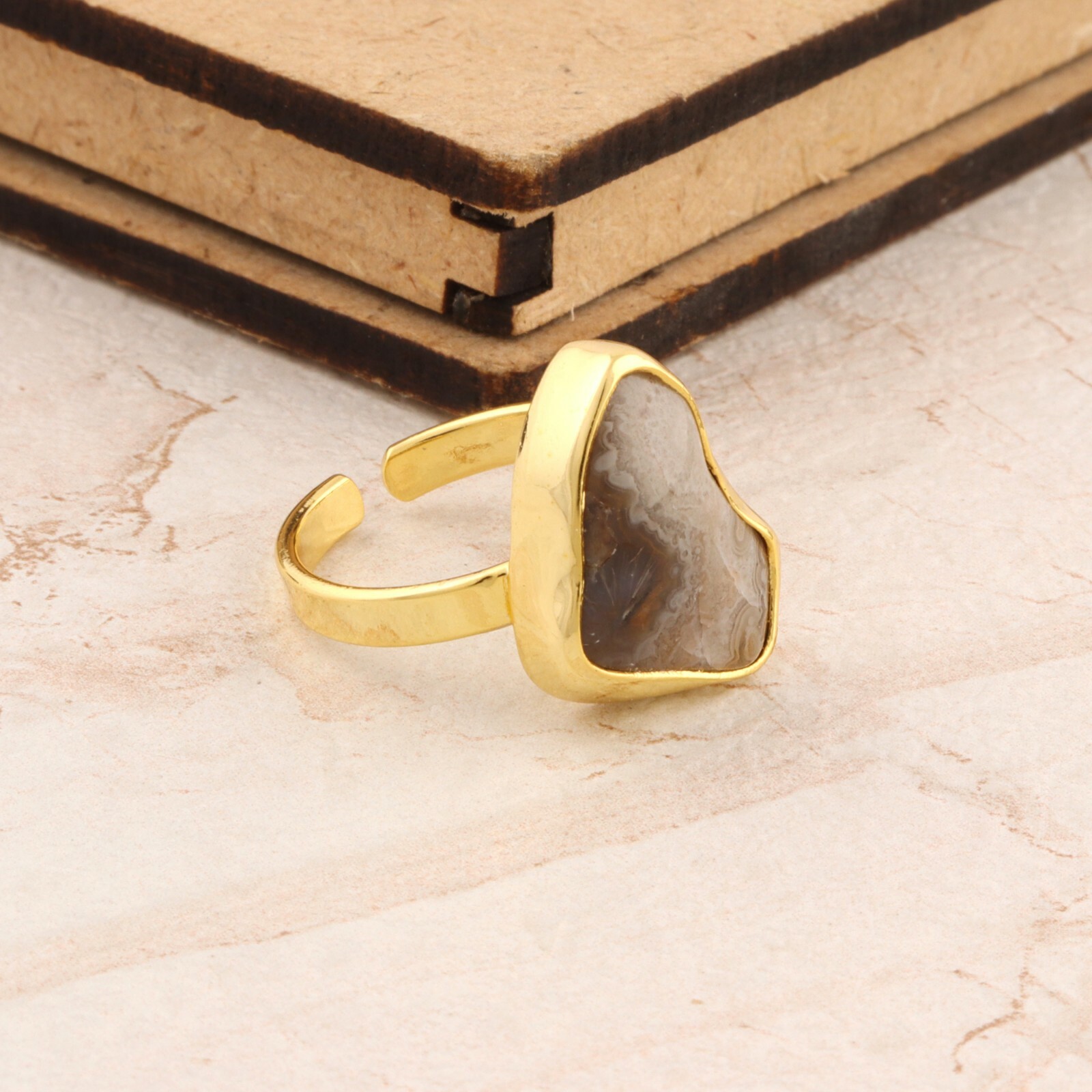 как выглядит Stunning Real Crazy Lace Agate Handmade Yellow Gold Plated Adjustable Ring фото