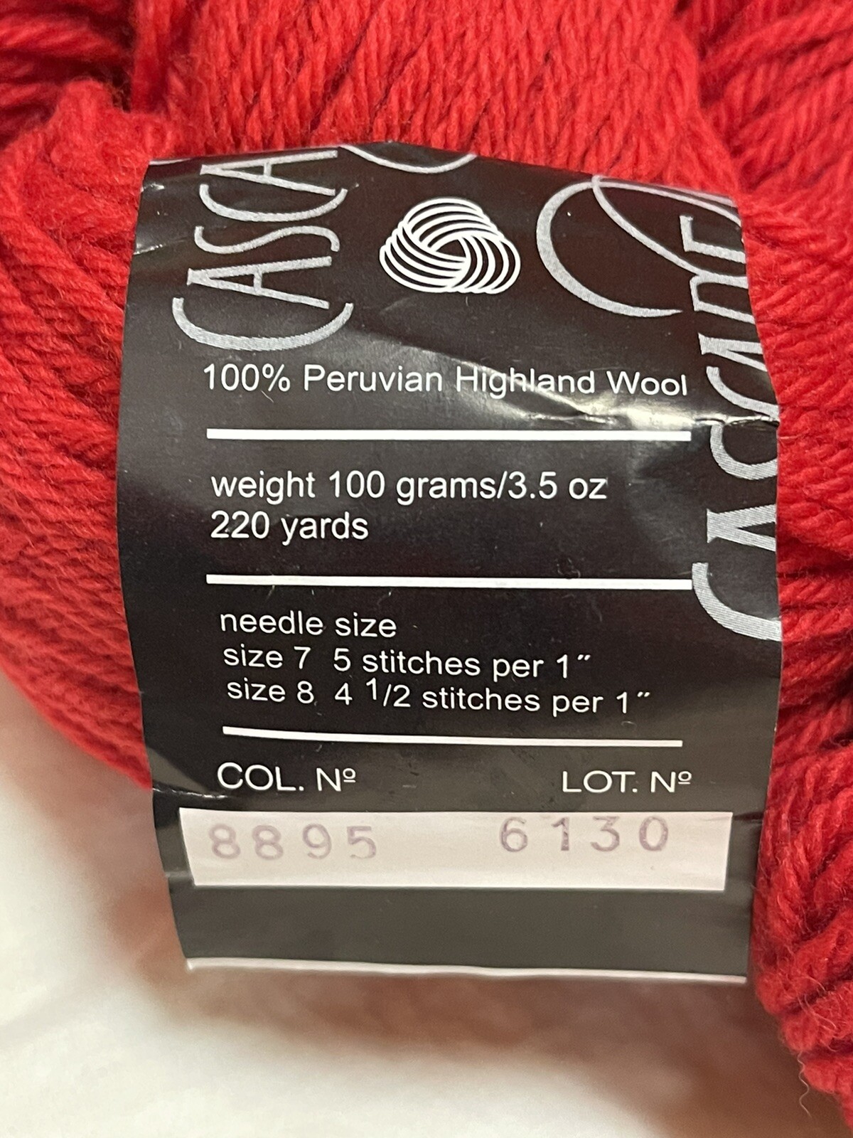 Lot Of Red Cascade Yarns 220, 100 Peruvian Highland Wool 4 Skeins 100 g Each