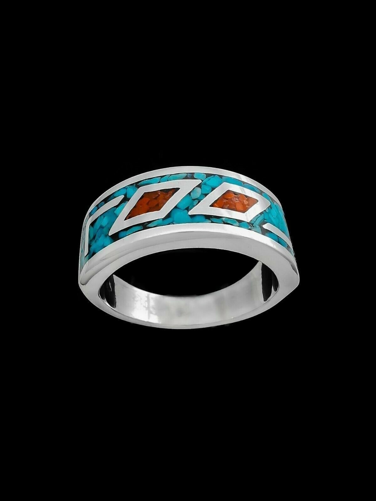 925 Sterling Silver Ladies Ring Turquoise and Coral Design Tribal Style