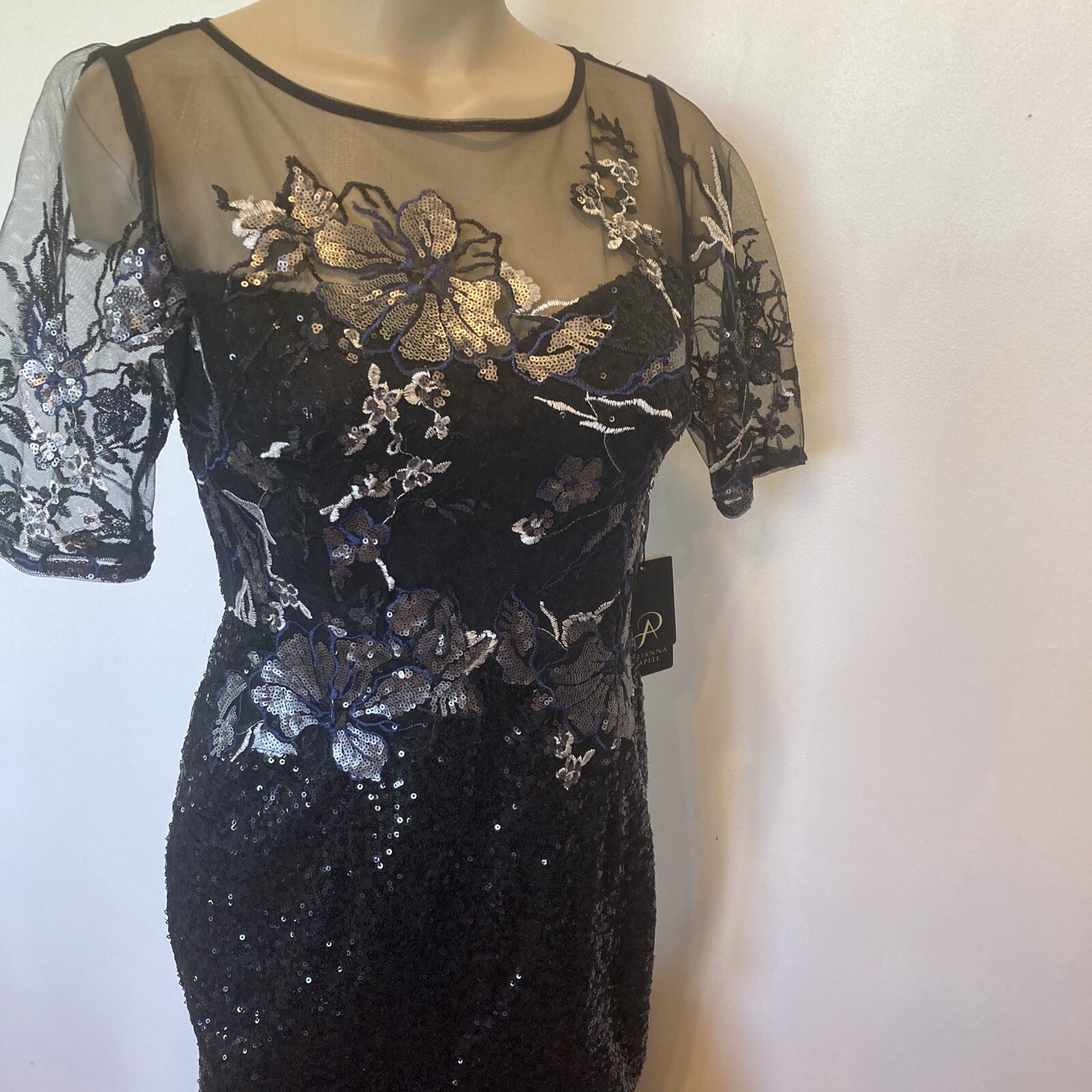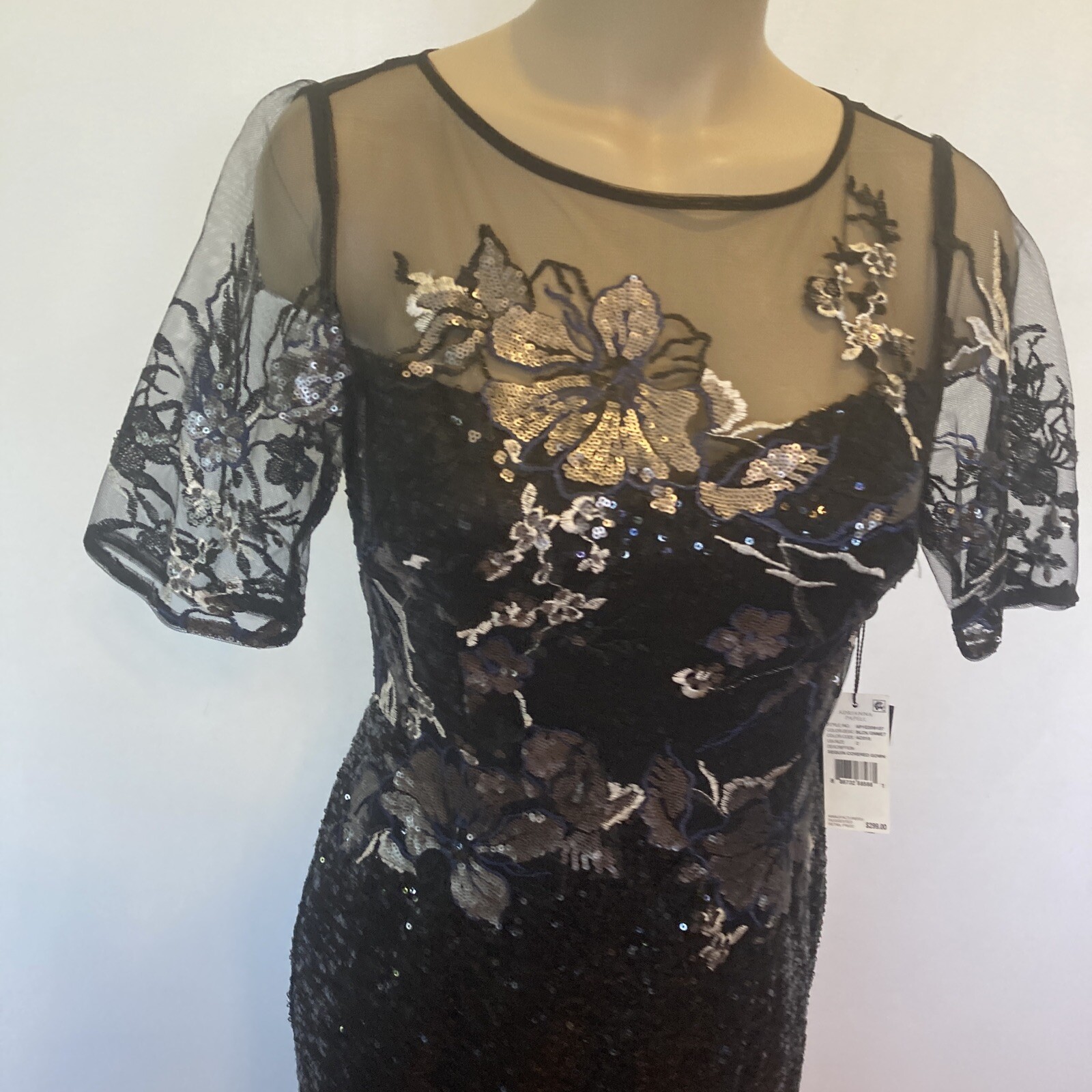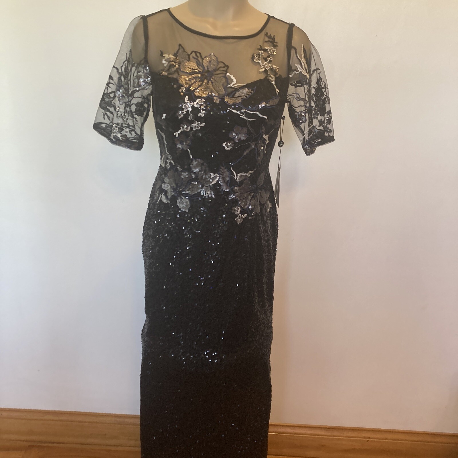 New Adrianna Papell size 2 black sequin covered gown w/embroidery top dress