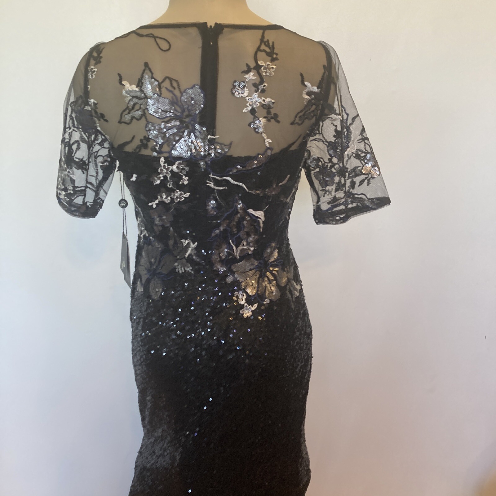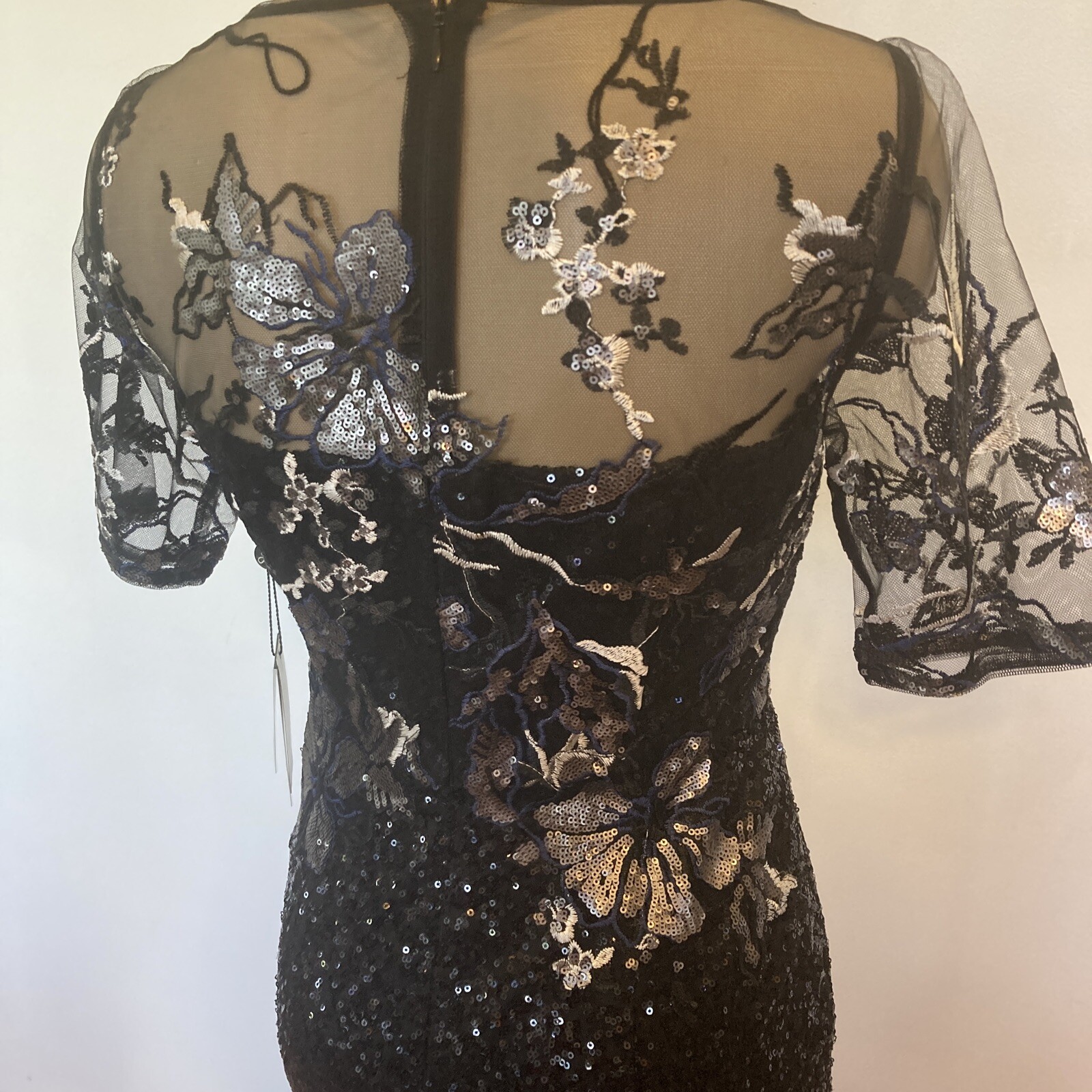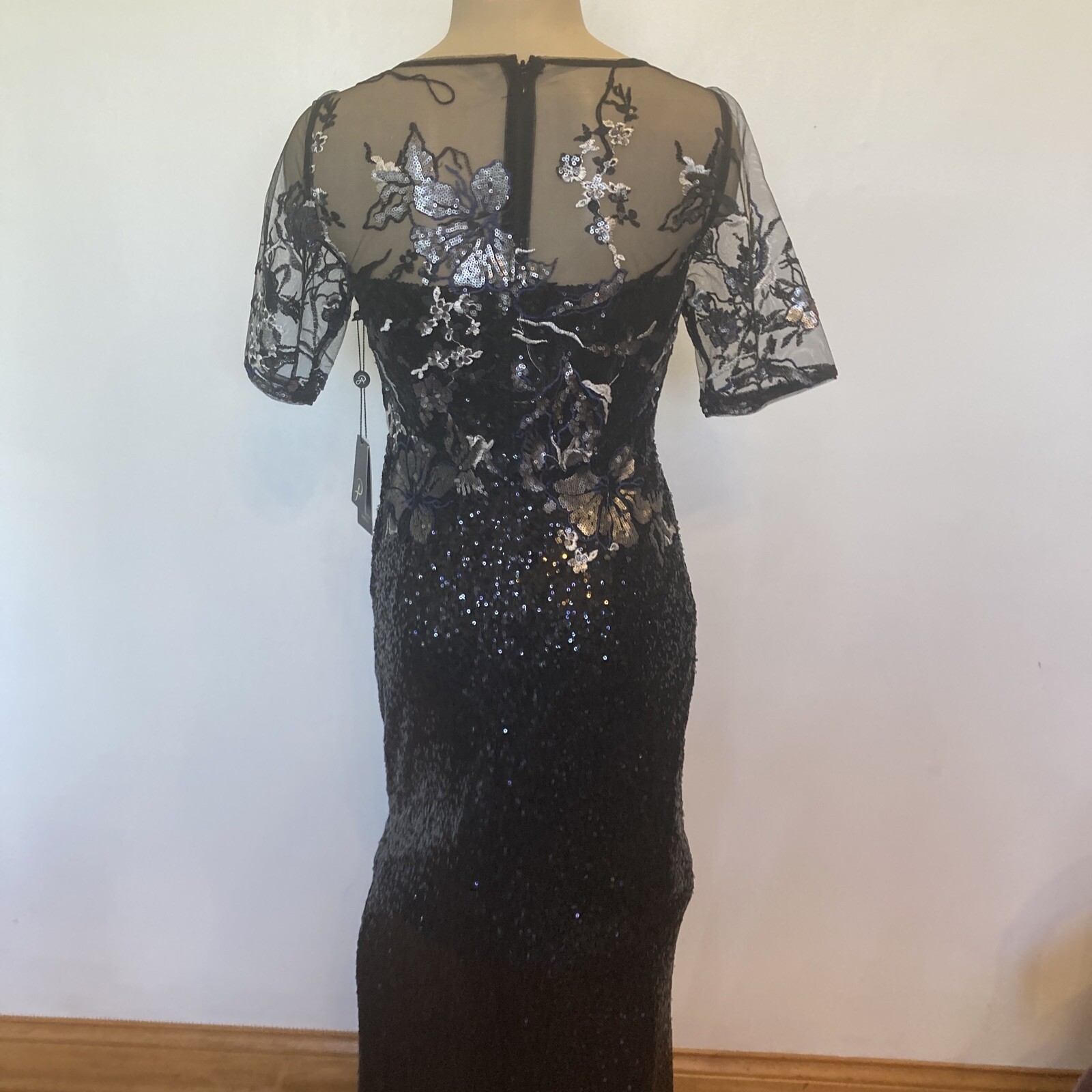 New Adrianna Papell size 2 black sequin covered gown w/embroidery top dress