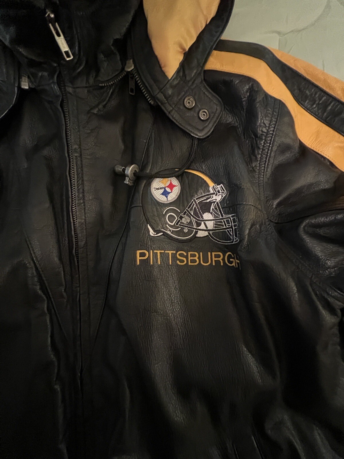 как выглядит Carl Banks Steelers Long Jacket With Hood XL Leather фото