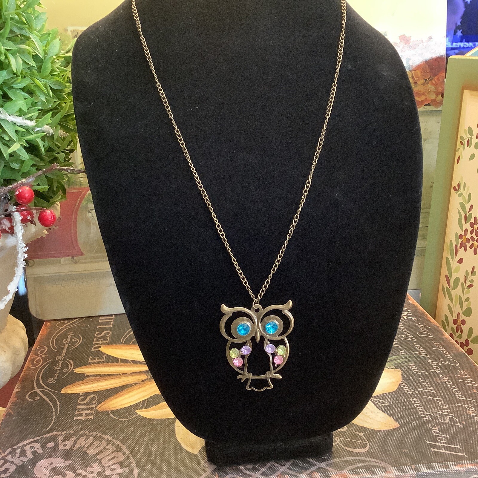 Metal Owl Necklace 23 L Colorful Jewels/Brushed Goldtone Finish Brand NEW