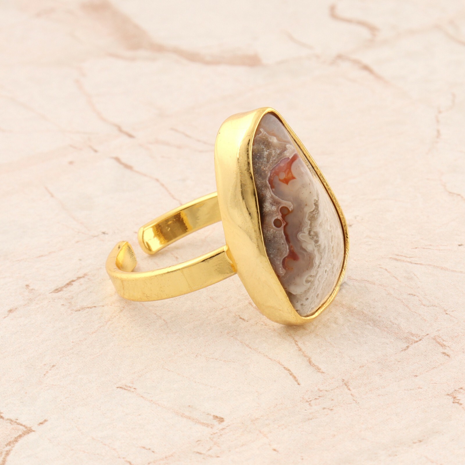 как выглядит Popular Design Natural Crazy Lace Agate Stone Yellow Gold Plated Adjustable Ring фото