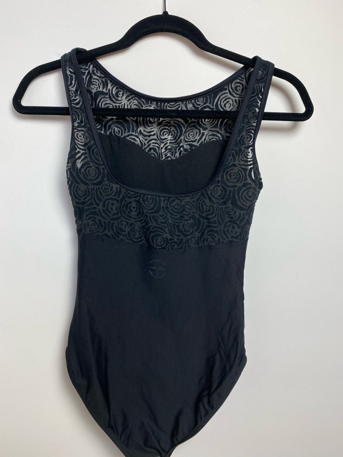 Wear Moi Ballet Leotard, size Adult Small. Black with rose design mesh.