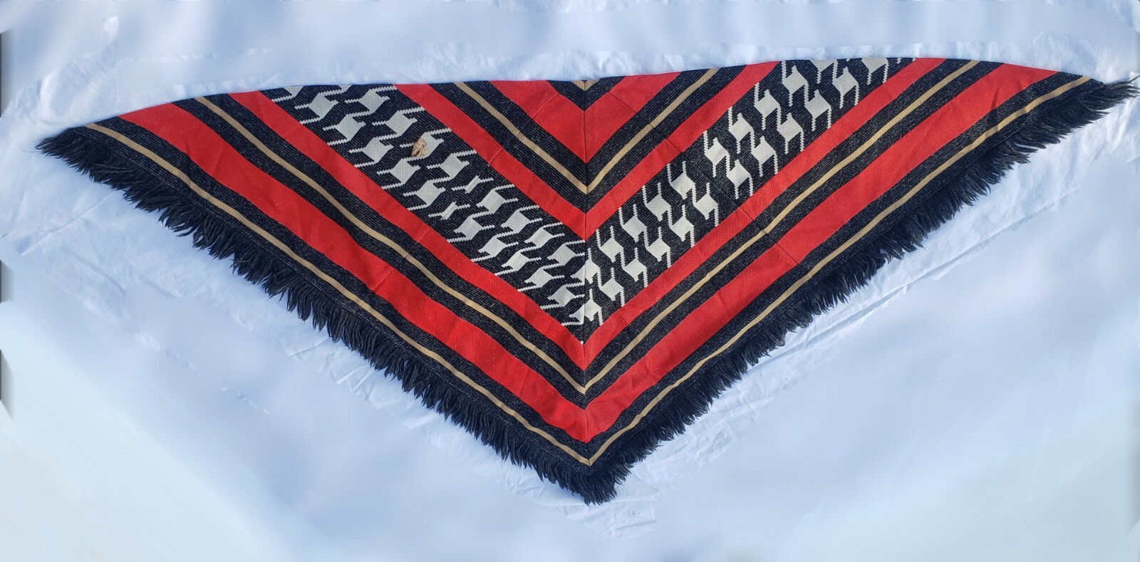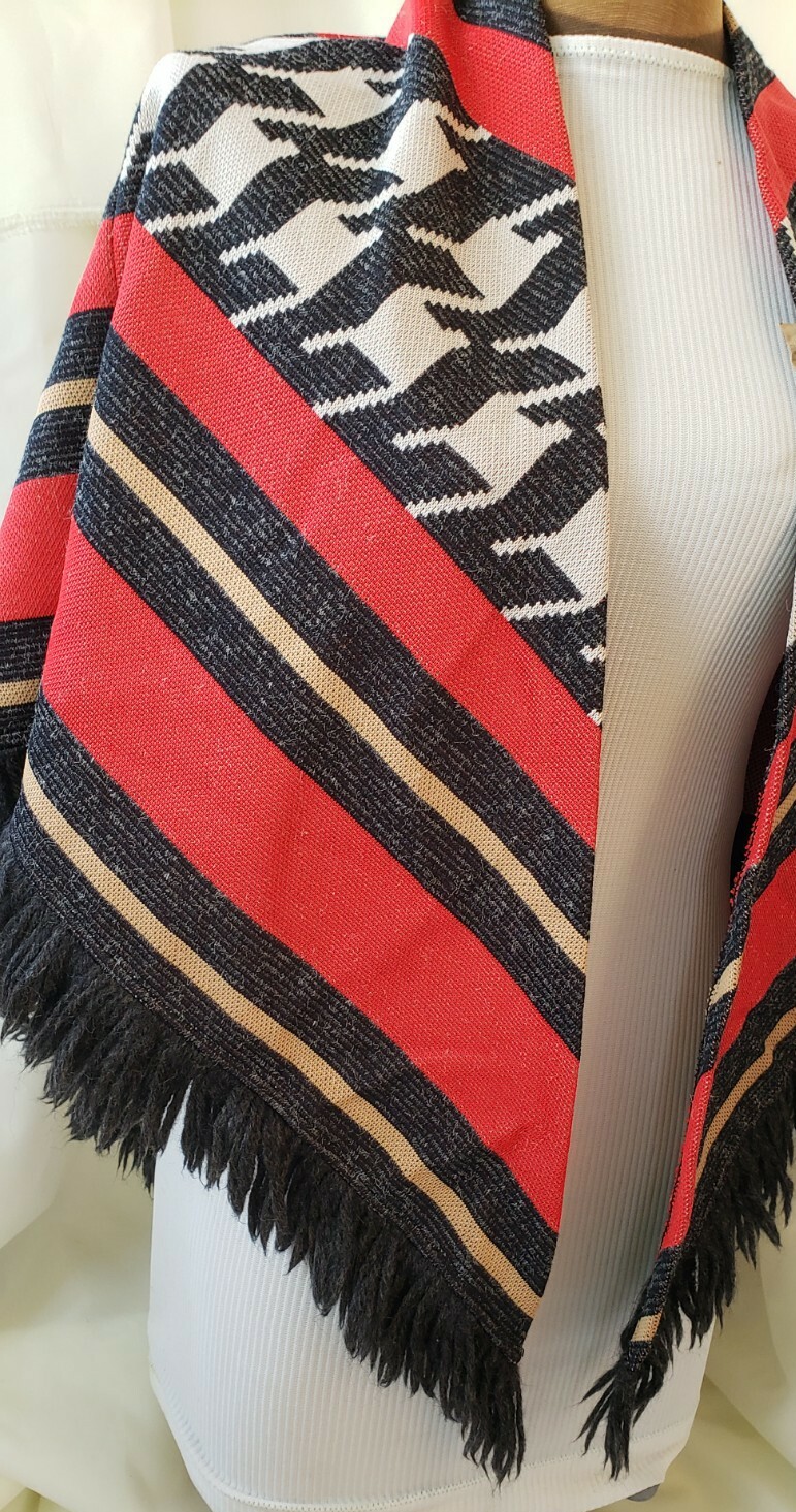 Vtg Red, Black White Shawl with Fringe Aztec Cape Wrap Poncho ILGWU Union Made