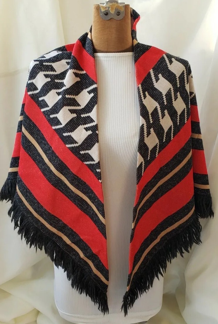 как выглядит Vtg Red, Black White Shawl with Fringe Aztec Cape Wrap Poncho ILGWU Union Made фото