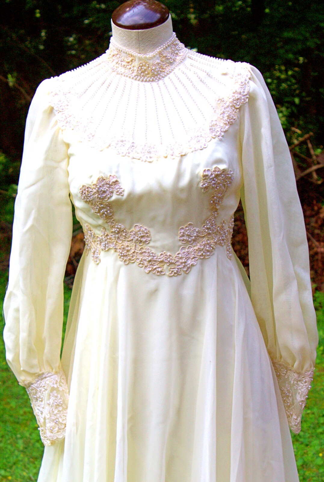 Vtg 80s Ivory Wedding Dress Veil Hi Neck Bead Sheer Cuffed Train Victorian Goth