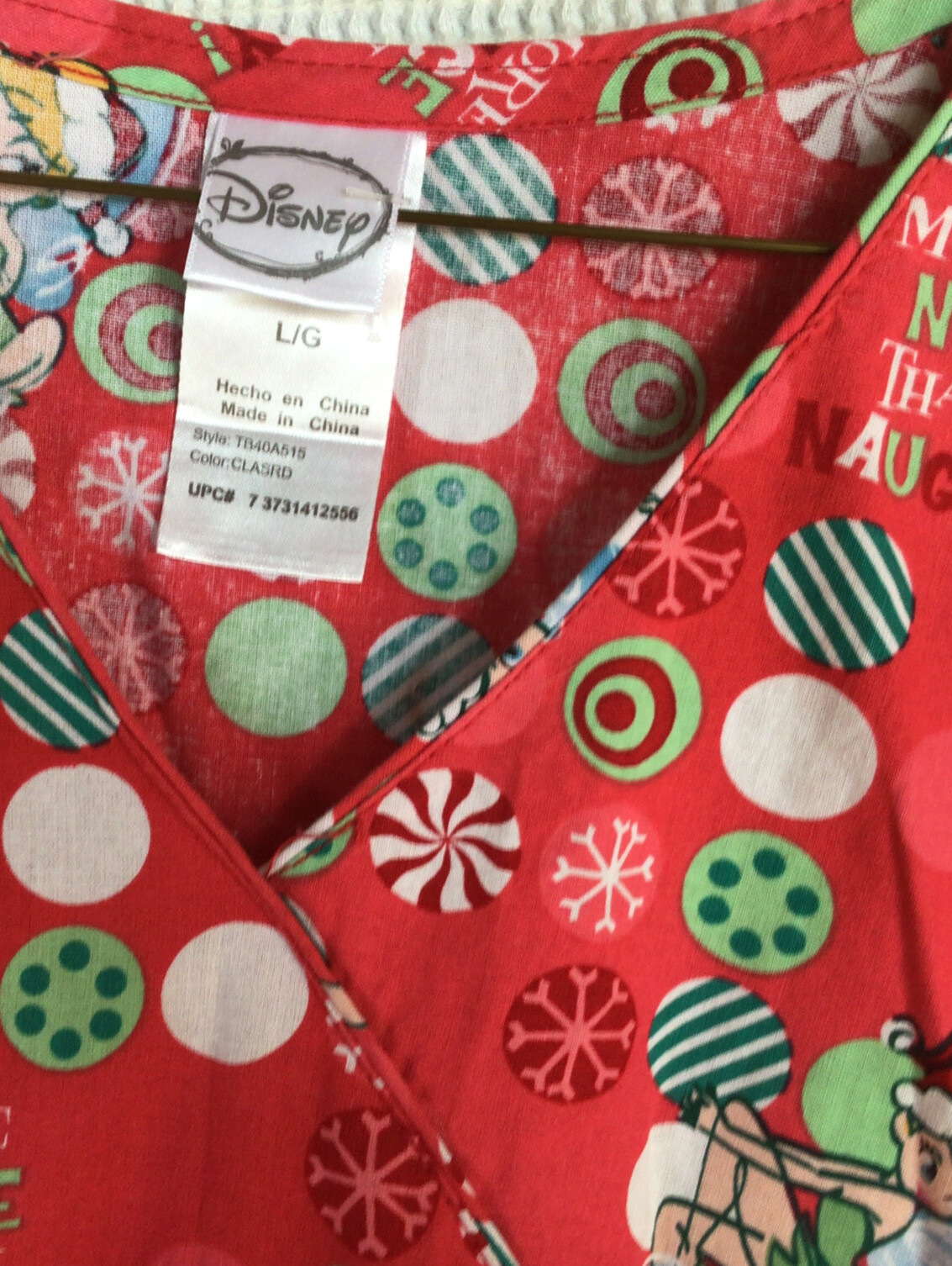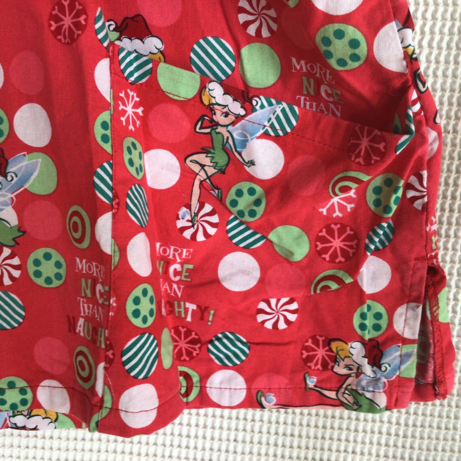 Disney Xmas scrub top Large Tinker Bell More Nice Than Naughty Santa Hat Back Ti