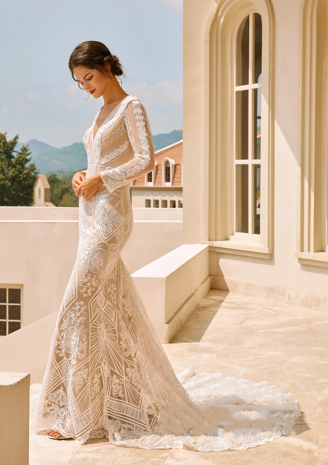 Sheath Mermaid Wedding Dresses V-Neck Long Sleeves Lace Appliques Bridal Gowns