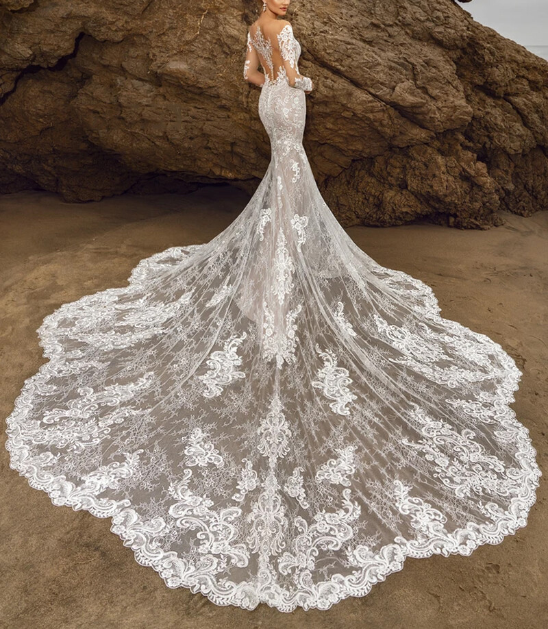 Luxury Mermaid Wedding Dress V-Neck Neckline Full Sleeves Lace Bridal Gown Train