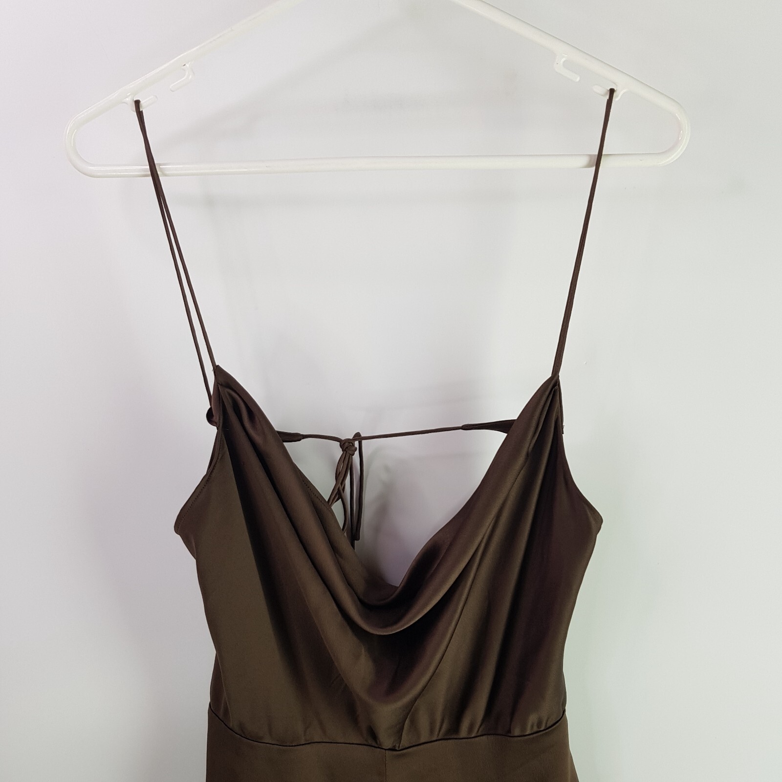 как выглядит Meshki Jumpsuit Womens Small Satin Brown Sleeveless Draped Collar Loose Wide Leg фото