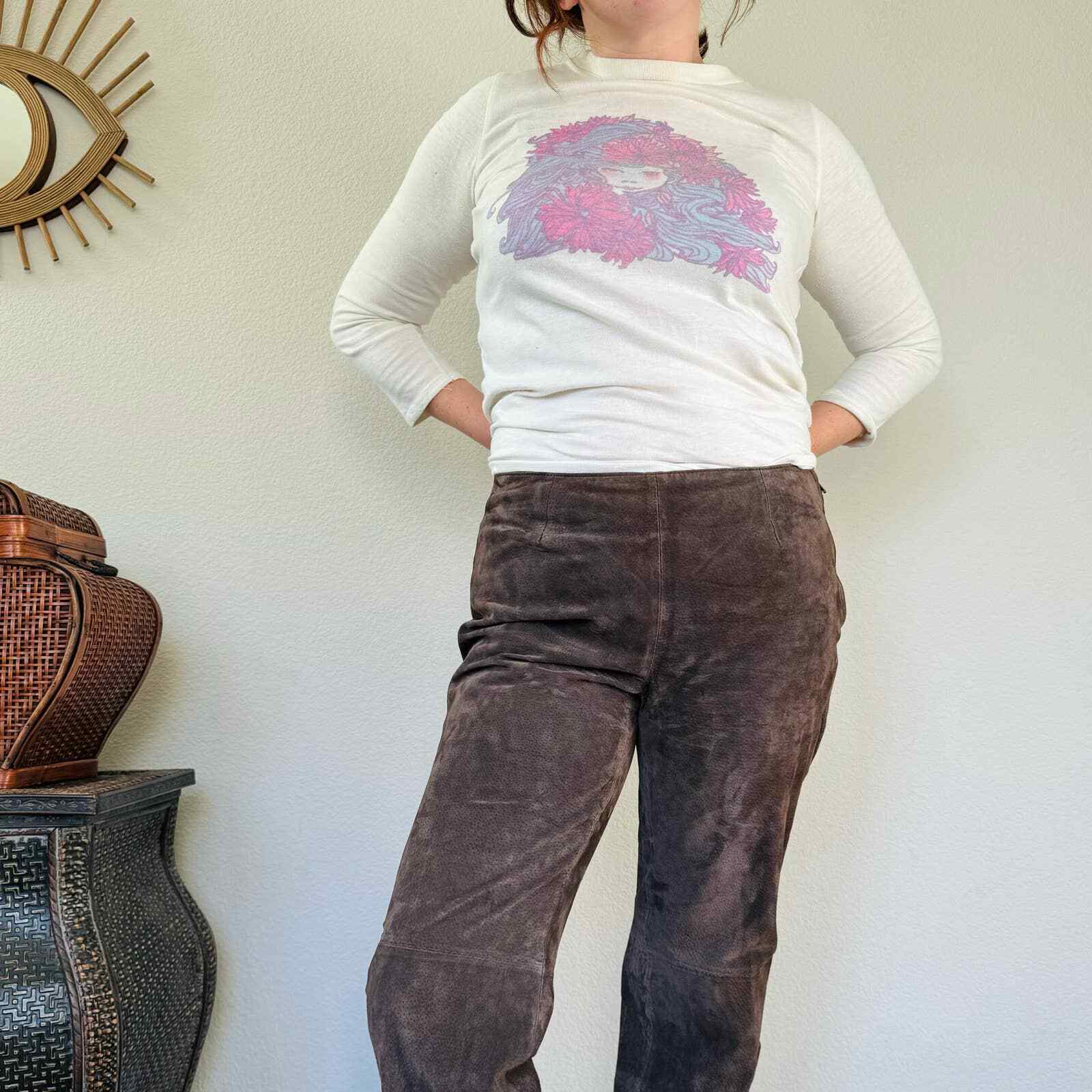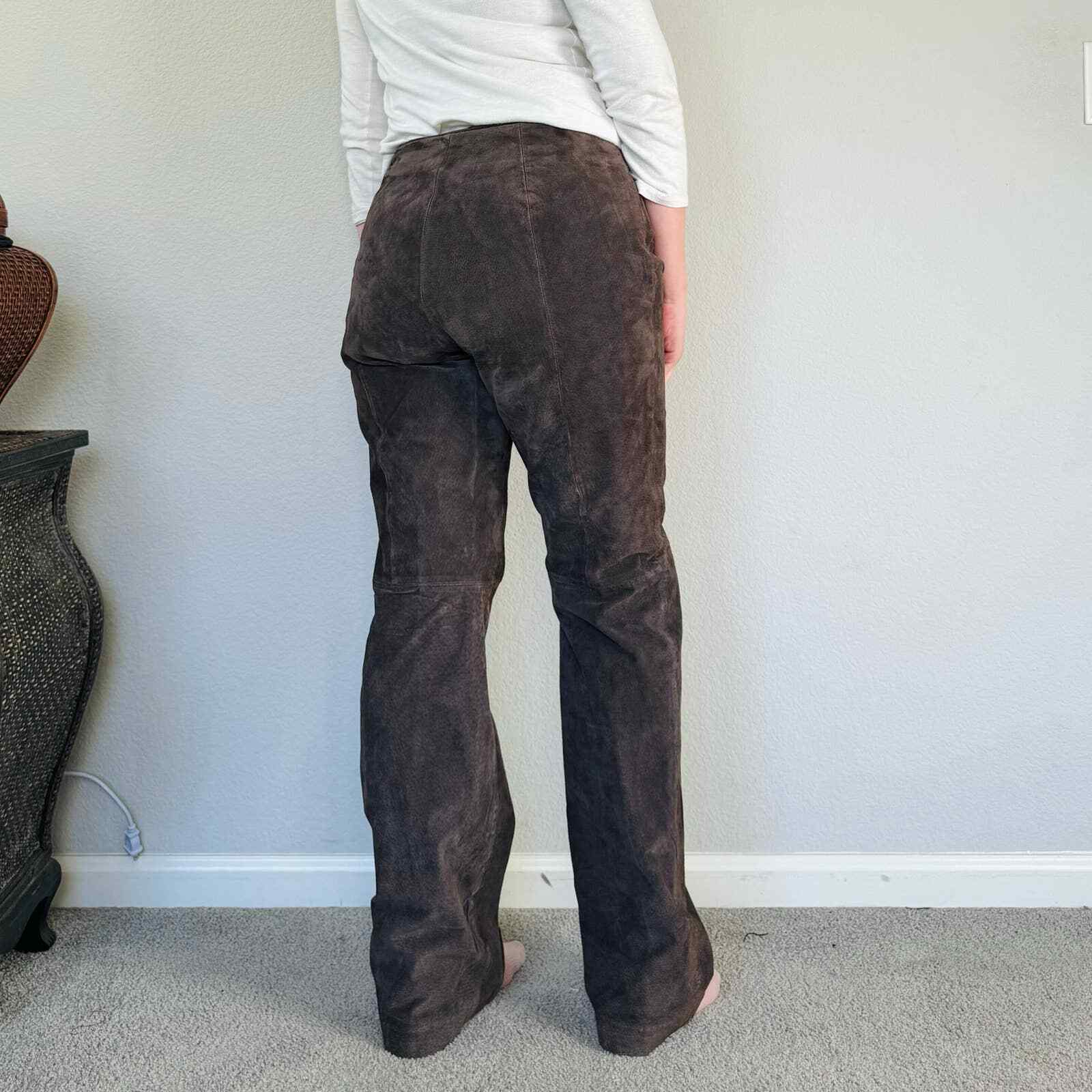 как выглядит Vintage 90s y2k genuine suede brown leather pants midrise flare M/L 10 фото