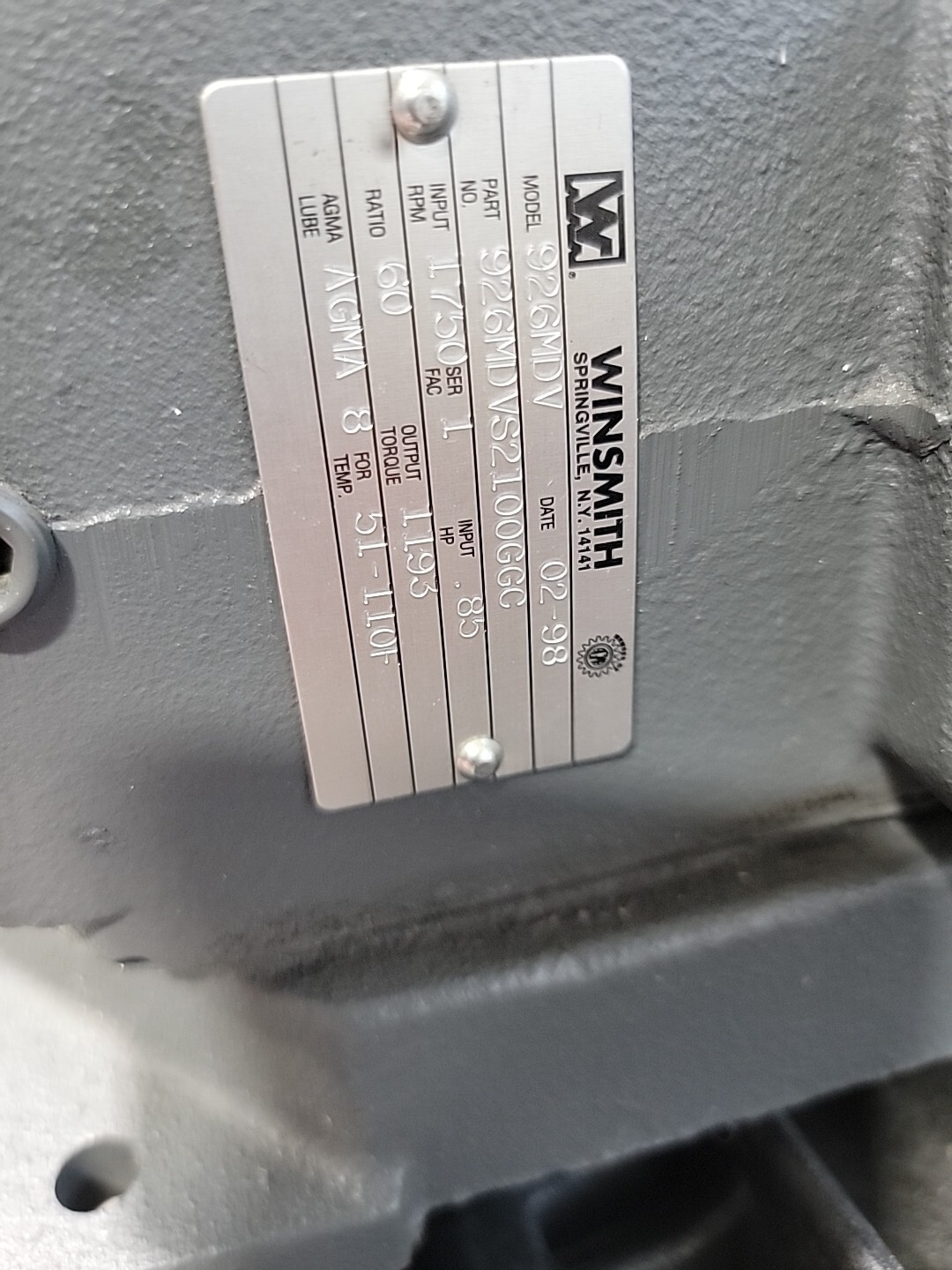 Winsmith 926MDV Gear Reducer Ratio 60:1 1750 RPM 926MDVS2100GGC