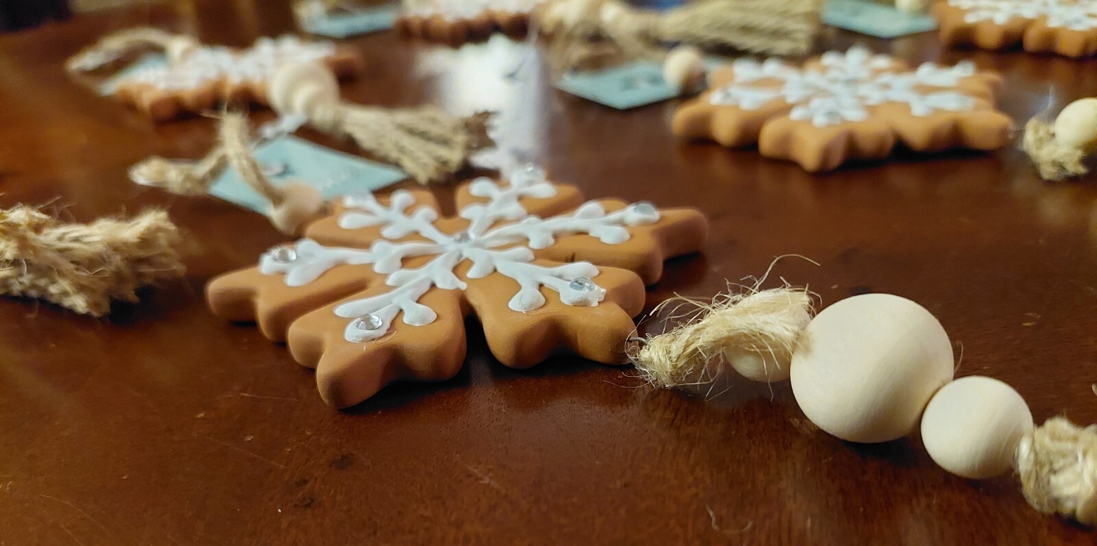 8 Rustic Beaded Gingerbread Cookie Snowflake Christmas Ornaments Hand Painted