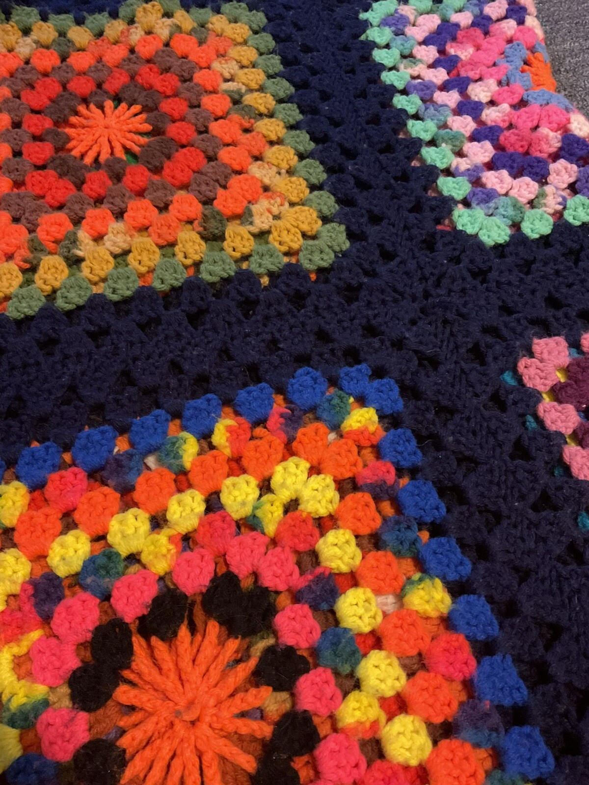 как выглядит Grannysquare Colorful And Navy Afghan VTG 12 sq. blanket throw 58 x45 фото